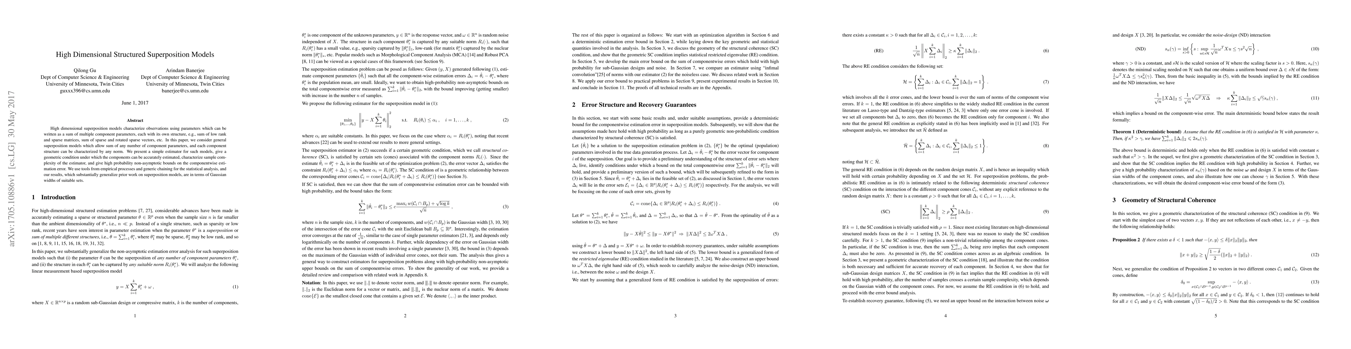 This paper develops a general estimator for high dimensional superposition models where observations are characterized by sums of component parameters with distinct structures. It provides non-asymptotic bounds on estimation error and analyzes sample complexity using tools from empirical processes and generic chaining.