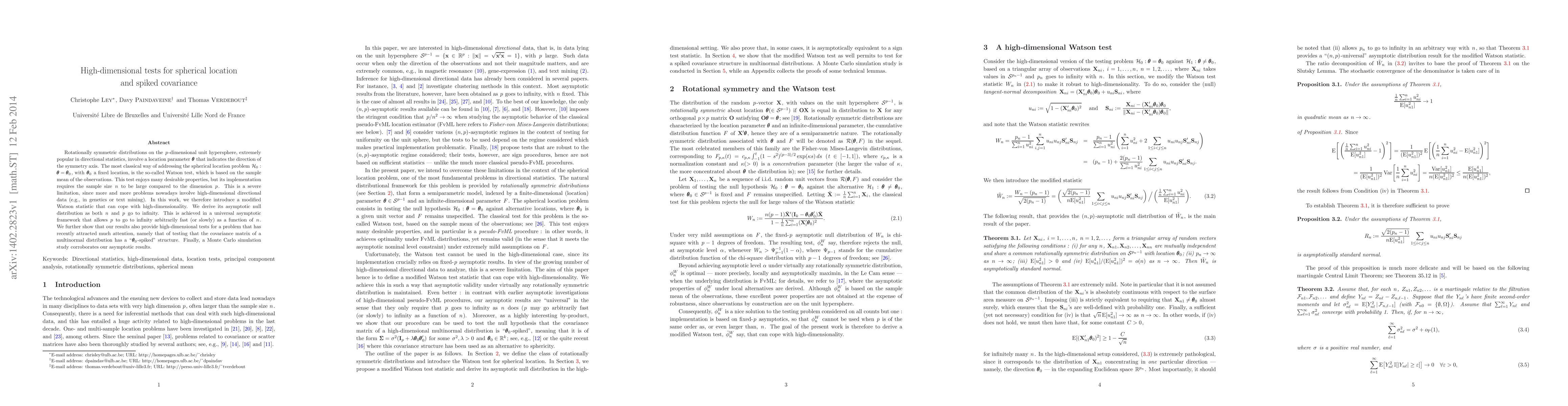 This paper introduces a modified Watson test for high-dimensional spherical location problems, addressing the limitations of the classical test in scenarios where the sample size is comparable to or smaller than the dimension. It also extends the approach to test for "theta_0-spiked" covariance structures in multivariate normal distributions, validated through asymptotic analysis and Monte Carlo simulations.