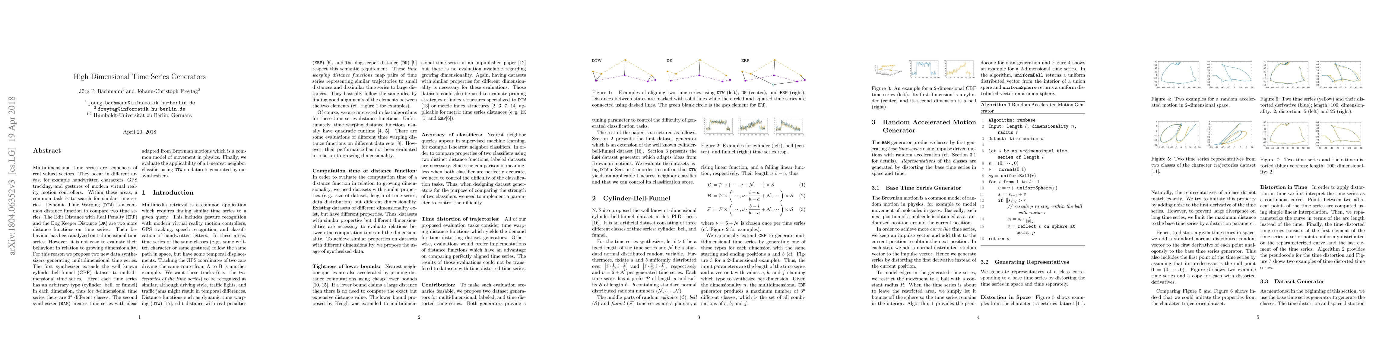 Multidimensional time series are sequences of real valued vectors. They occur in different areas, for example handwritten characters, GPS tracking, and gestures of modern virtual reality motion controllers. Within these areas, a common task is to search for similar time series. Dynamic Time Warping (DTW) is a common distance function to compare two time series. The Edit Distance with Real Penalty (ERP) and the Dog Keeper Distance (DK) are two more distance functions on time series. Their behaviour has been analyzed on 1-dimensional time series. However, it is not easy to evaluate their behaviour in relation to growing dimensionality. For this reason we propose two new data synthesizers generating multidimensional time series. The first synthesizer extends the well known cylinder-bell-funnel (CBF) dataset to multidimensional time series. Here, each time series has an arbitrary type (cylinder, bell, or funnel) in each dimension, thus for $d$-dimensional time series there are $3^{d}$ different classes. The second synthesizer (RAM) creates time series with ideas adapted from Brownian motions which is a common model of movement in physics. Finally, we evaluate the applicability of a 1-nearest neighbor classifier using DTW on datasets generated by our synthesizers.