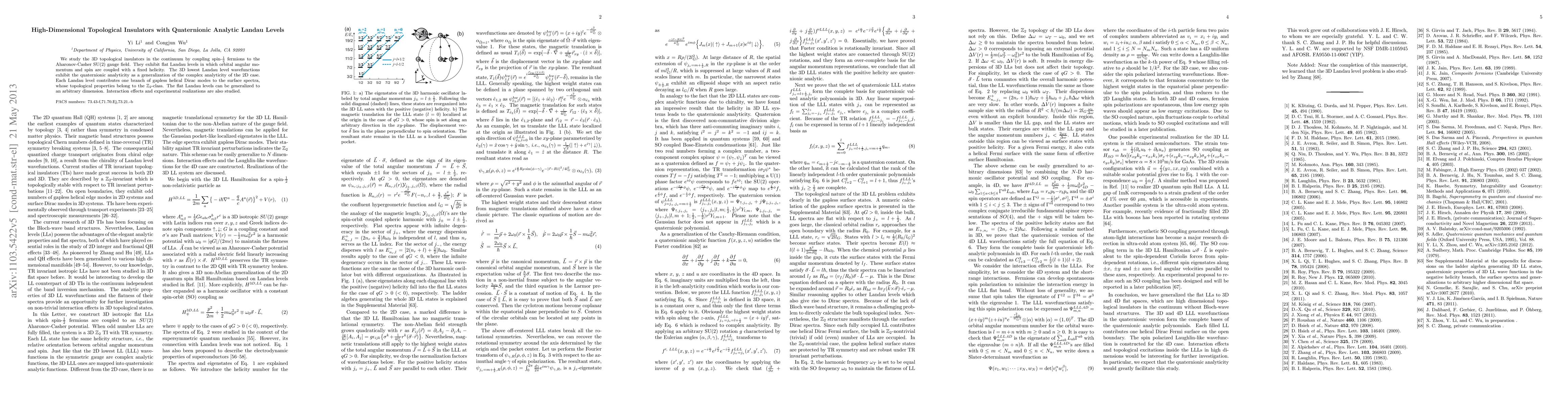 This paper investigates 3D topological insulators with spin-1/2 fermions coupled to an SU(2) gauge field, revealing flat Landau levels with quaternionic analyticity. The surface states exhibit Z2-class topological properties and helical Dirac modes.