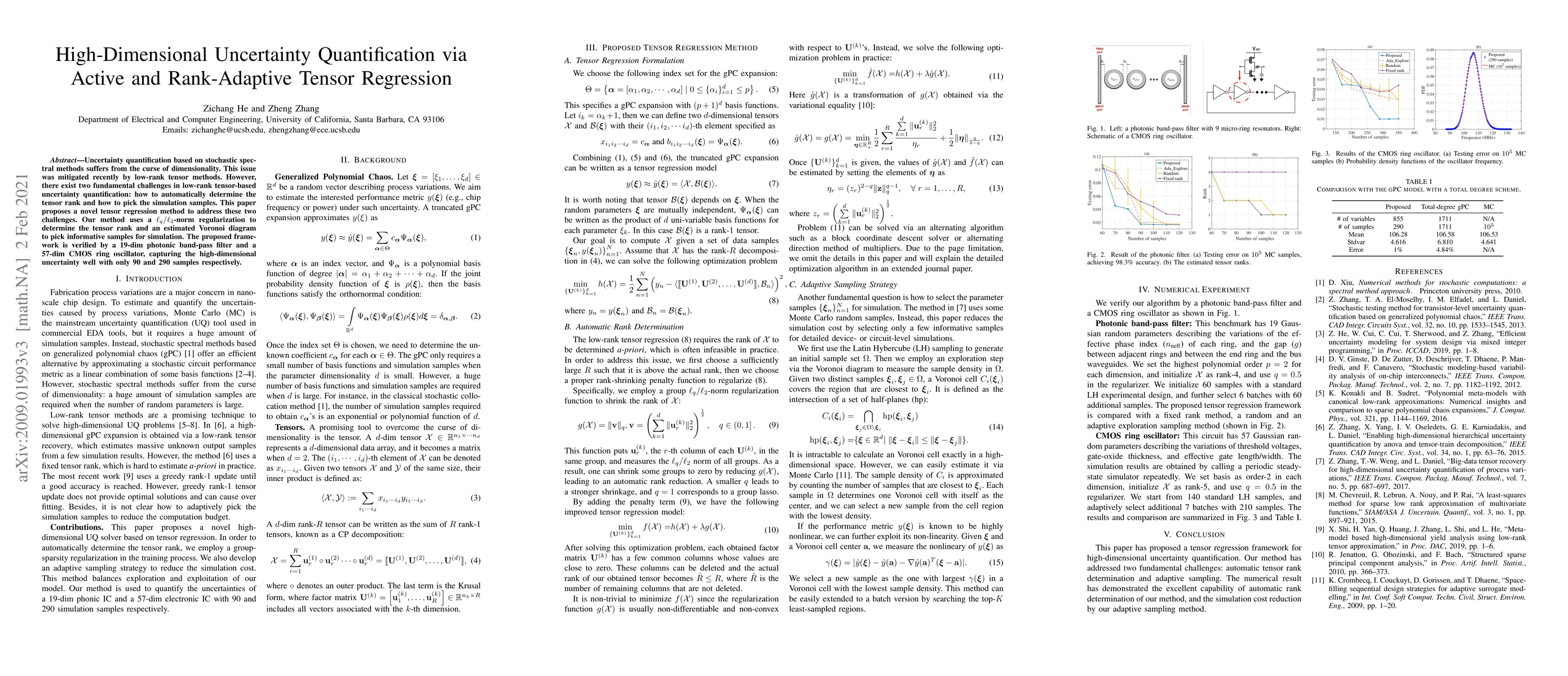 Uncertainty quantification based on stochastic spectral methods suffers from the curse of dimensionality. This issue was mitigated recently by low-rank tensor methods. However, there exist two fundamental challenges in low-rank tensor-based uncertainty quantification: how to automatically determine the tensor rank and how to pick the simulation samples. This paper proposes a novel tensor regression method to address these two challenges. Our method uses an $\ell_{q}/ \ell_{2}$-norm regularization to determine the tensor rank and an estimated Voronoi diagram to pick informative samples for simulation. The proposed framework is verified by a 19-dim phonics bandpass filter and a 57-dim CMOS ring oscillator, capturing the high-dimensional uncertainty well with only 90 and 290 samples respectively.