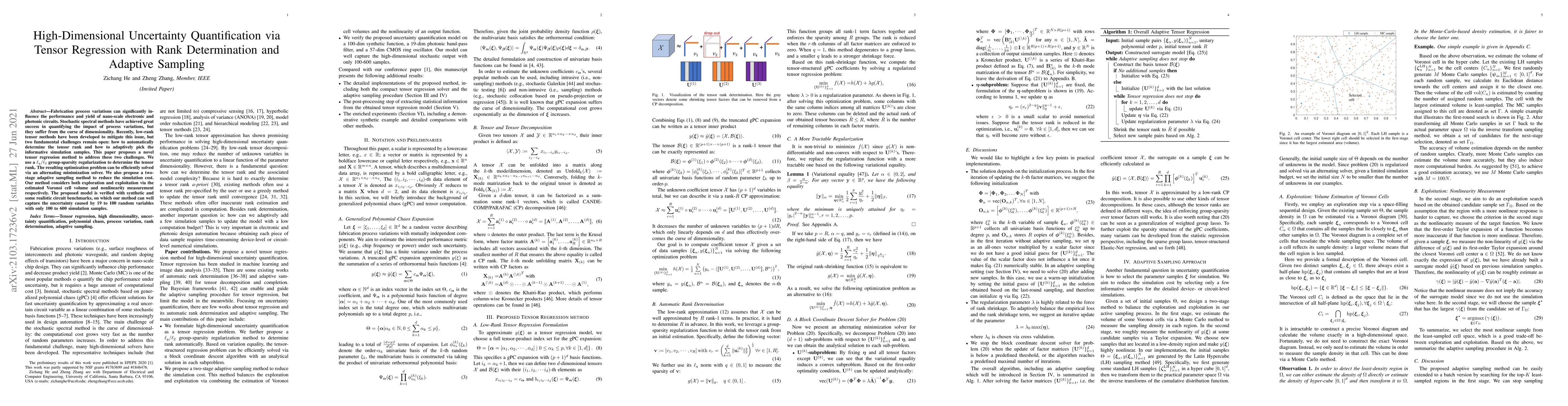 This paper proposes a tensor regression method with rank determination and adaptive sampling to quantify high-dimensional uncertainties in nano-scale circuits. It uses $\ell_{q}/ \ell_{2}$ regularization for rank determination and a two-stage adaptive sampling method to efficiently manage simulation costs.