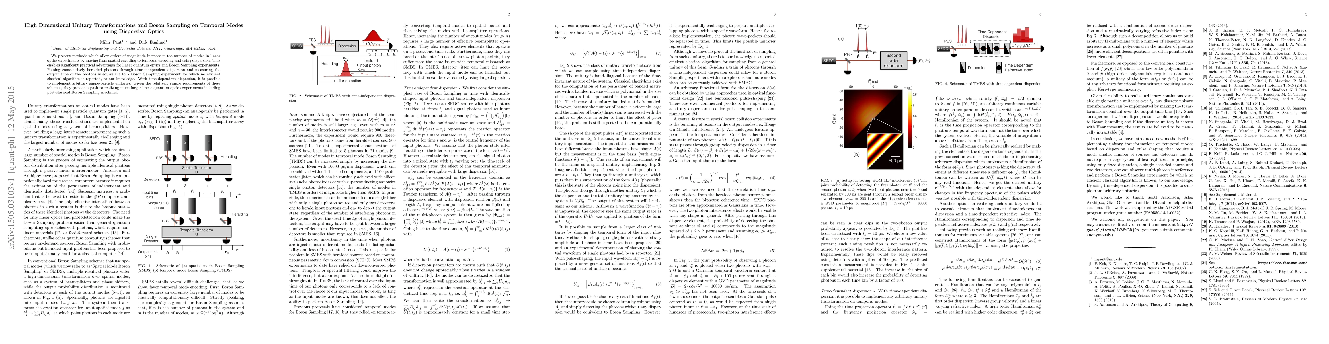 We present methods which allow orders of magnitude increase in the number of modes in linear optics experiments by moving from spatial encoding to temporal encoding and using dispersion. This enables significant practical advantages for linear quantum optics and Boson Sampling experiments. Passing consecutively heralded photons through time-independent dispersion and measuring the output time of the photons is equivalent to a Boson Sampling experiment for which no efficient classical algorithm is reported, to our knowledge. With time-dependent dispersion, it is possible to implement arbitrary single-particle unitaries. Given the relatively simple requirements of these schemes, they provide a path to realizing much larger linear quantum optics experiments including post-classical Boson Sampling machines.