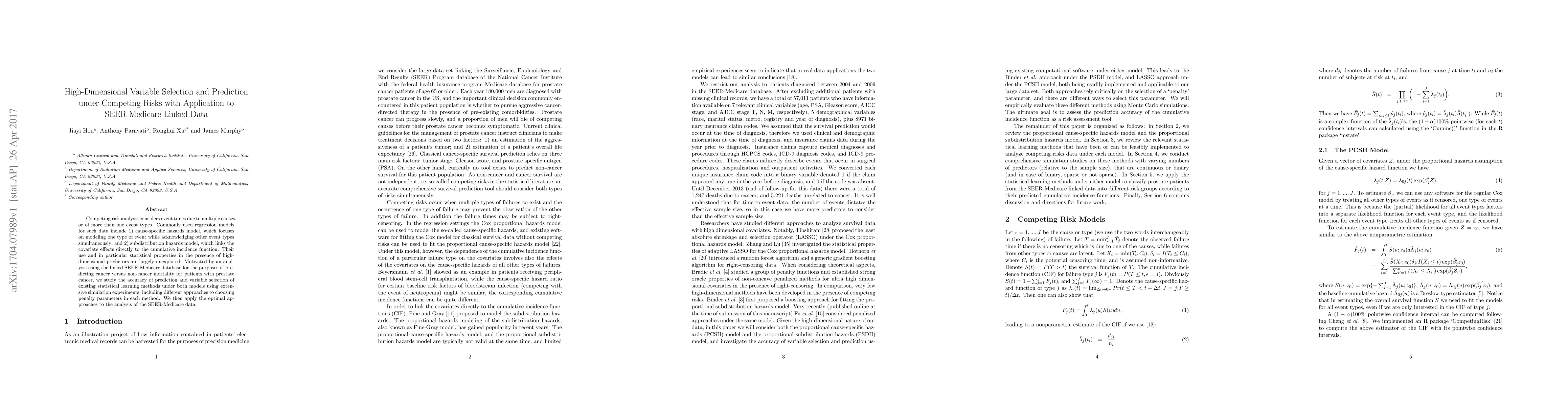 This paper investigates high-dimensional variable selection and prediction under competing risks using the SEER-Medicare linked data, focusing on cancer versus non-cancer mortality in prostate cancer patients. It evaluates the performance of existing statistical learning methods under cause-specific and subdistribution hazards models through extensive simulation and real data analysis.