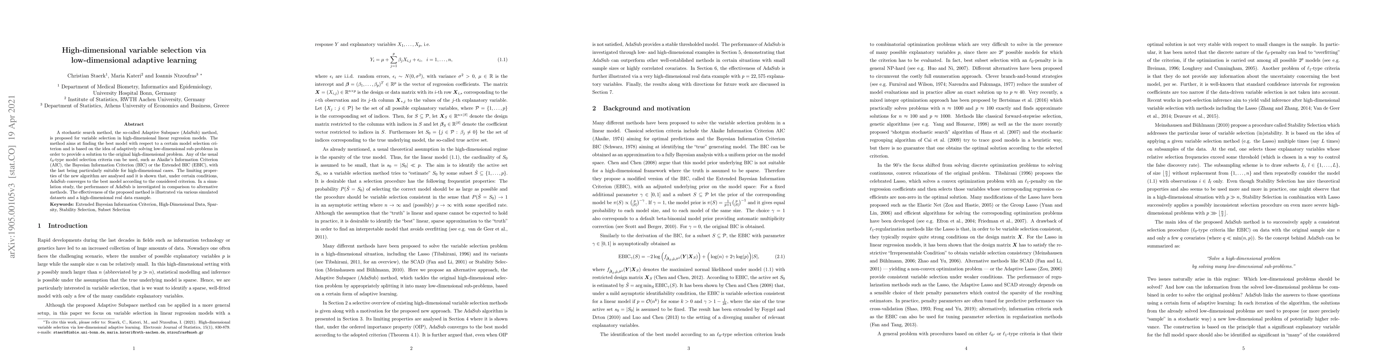 The paper proposes a stochastic search method, Adaptive Subspace (AdaSub), for variable selection in high-dimensional linear regression models. It builds nested subsets of explanatory variables and solves low-dimensional sub-problems adaptively to find the best model based on a given model selection criterion, such as AIC, BIC, or Extended BIC.