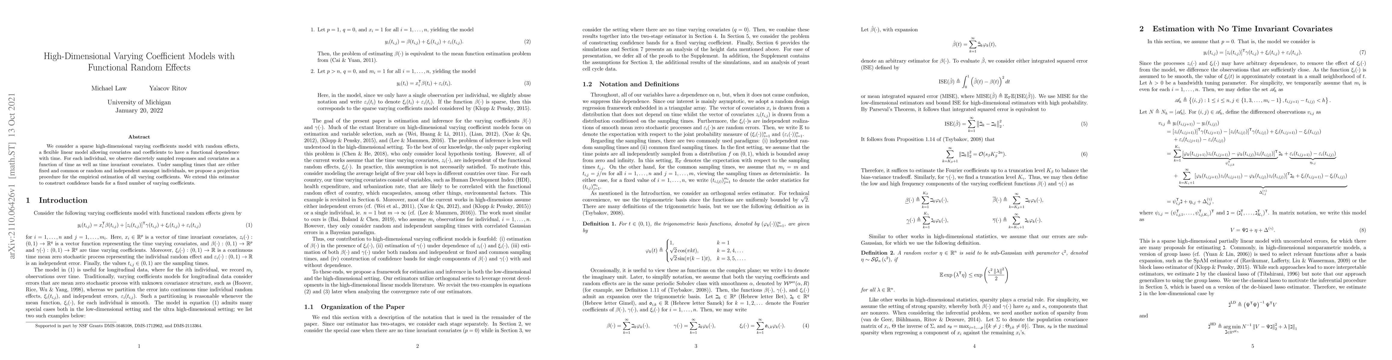 This paper proposes a method for estimating sparse high-dimensional varying coefficient models with functional random effects, allowing for functional dependence of covariates and coefficients over time. It introduces a projection procedure for empirical estimation and constructs confidence bands for a fixed number of varying coefficients.