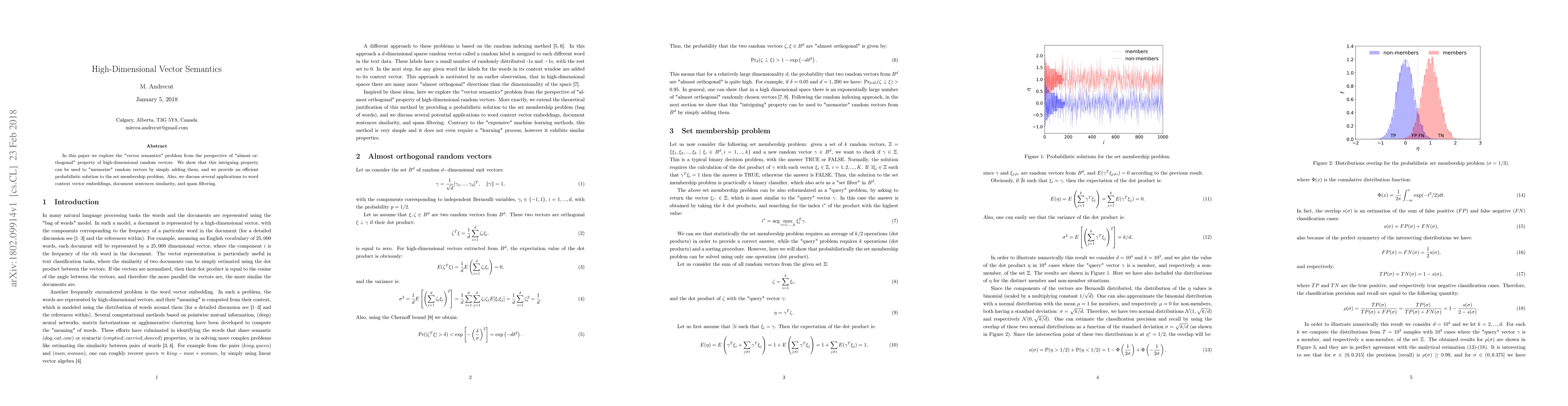 In this paper we explore the "vector semantics" problem from the perspective of "almost orthogonal" property of high-dimensional random vectors. We show that this intriguing property can be used to "memorize" random vectors by simply adding them, and we provide an efficient probabilistic solution to the set membership problem. Also, we discuss several applications to word context vector embeddings, document sentences similarity, and spam filtering.