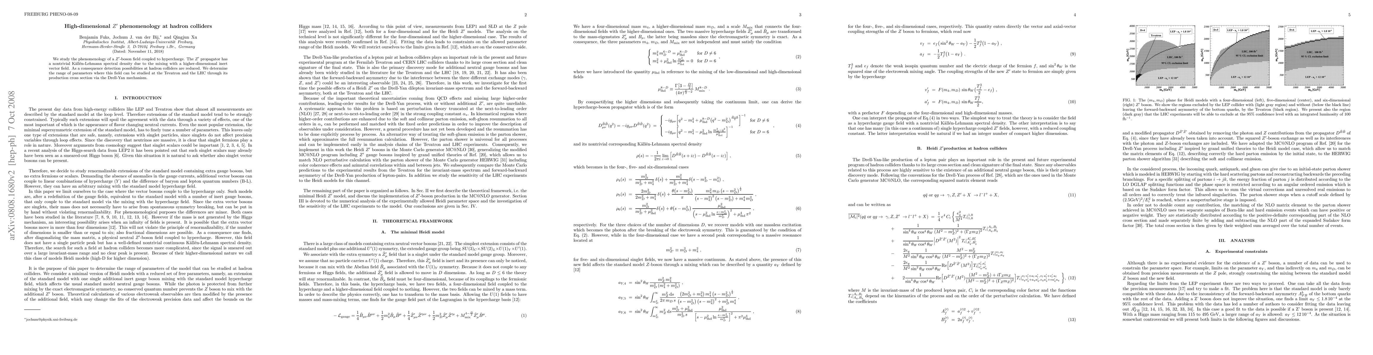 This paper explores the high-dimensional Z'-boson phenomenology at hadron colliders, examining its reduced detection possibilities due to mixing with a higher-dimensional inert vector field. It determines the parameter ranges for studying the Z' via Drell-Yan production at the Tevatron and LHC.