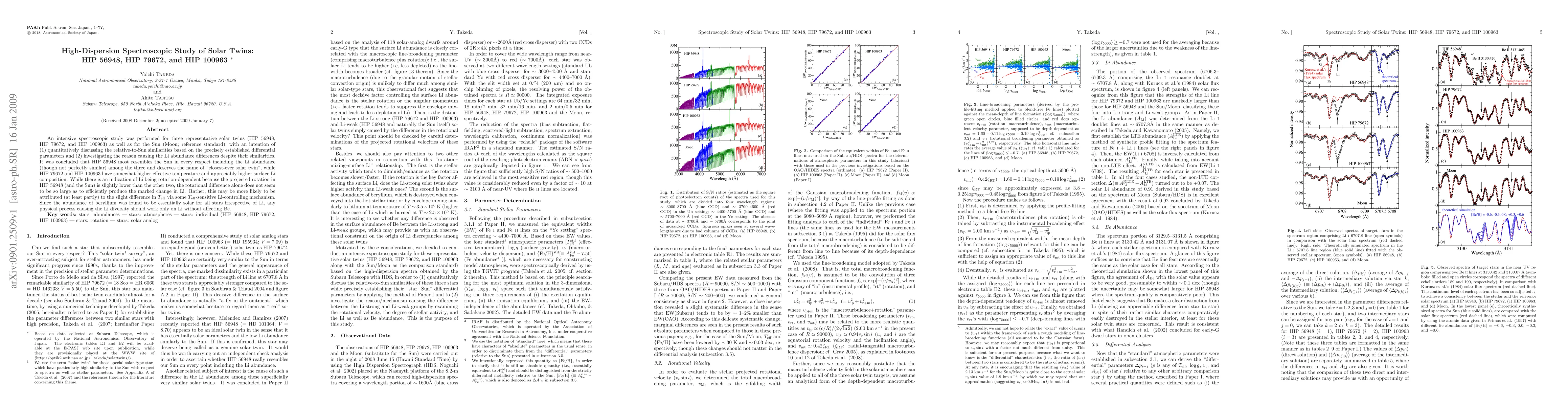 An intensive spectroscopic study was performed for three representative solar twins (HIP 56948, HIP 79672, and HIP 100963) as well as for the Sun (Moon; reference standard), with an intention of (1) quantitatively discussing the relative-to-Sun similarities based on the precisely established differential parameters and (2) investigating the reason causing the Li abundance differences despite their similarities. It was concluded that HIP 56948 most resembles the Sun in every respect including the Li abundance (though not perfectly similar) among the three and deserves the name of "closest-ever solar twin", while HIP 79672 and HIP 100963 have somewhat higher effective temperature and appreciably higher surface Li composition. While there is an indication of Li being rotation-dependent because the projected rotation in HIP 56948 (and the Sun) is slightly lower than the other two, the rotational difference alone does not seem to be so large as to efficiently produce the marked change in Li. Rather, this may be more likely to be attributed (at least partly) to the slight difference in T_eff via some T_eff-sensitive Li-controlling mechanism. Since the abundance of beryllium was found to be essentially solar for all stars irrespective of Li, any physical process causing the Li diversity should work only on Li without affecting Be.