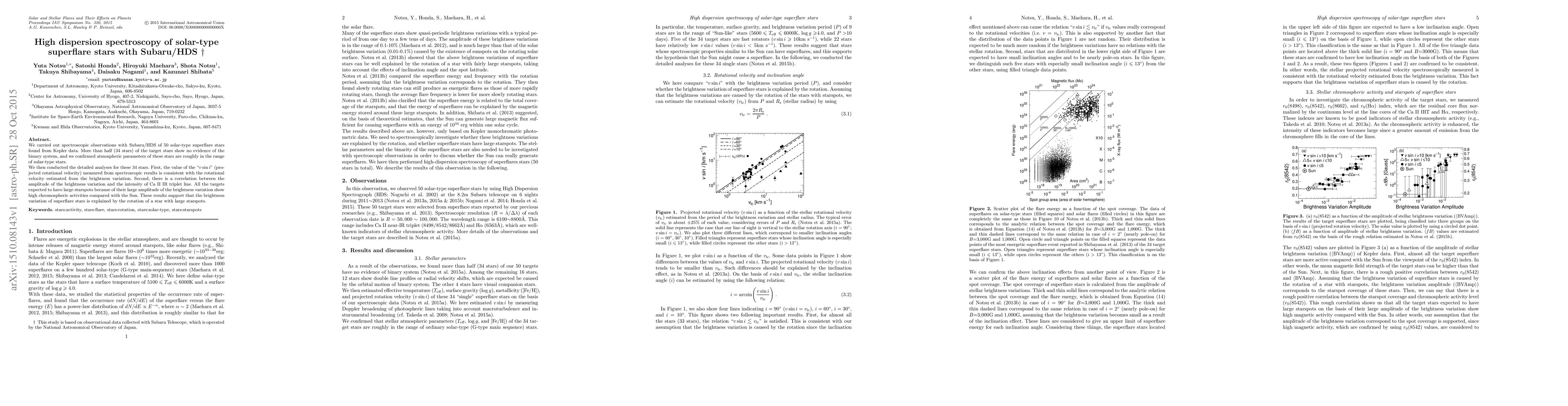 This study used Subaru/HDS to observe 50 solar-type superflare stars, finding that 34 show no binary companions and have solar-type atmospheric parameters. The research confirms a correlation between brightness variation amplitude and Ca II IR triplet line intensity, supporting that large starspots and rotation drive the brightness variations in these stars.