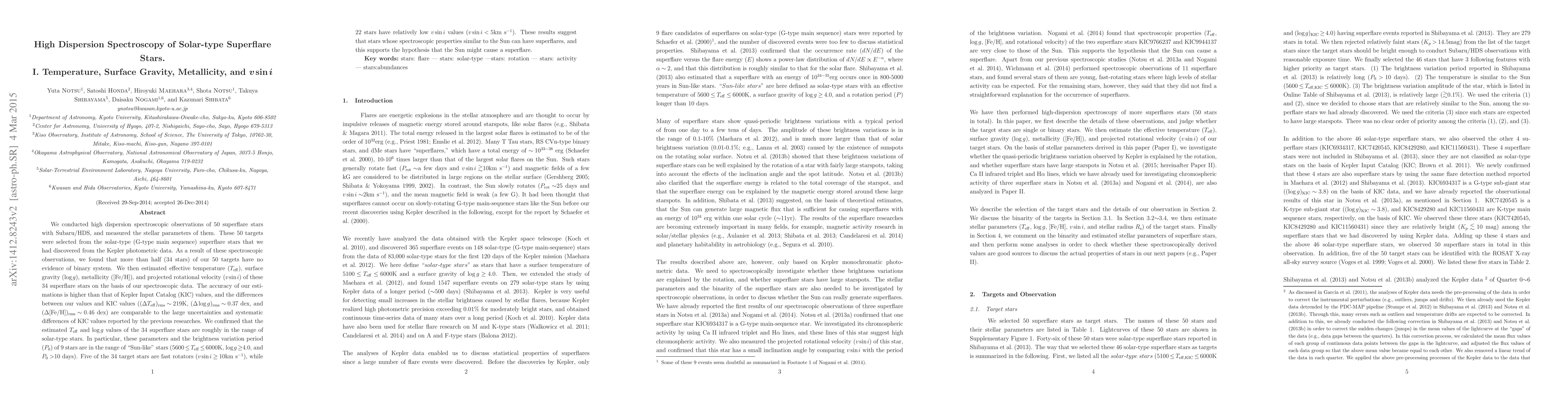 This study utilized high dispersion spectroscopy to measure the stellar parameters of 50 solar-type superflare stars, revealing that 34 stars lack binary companions. The research found that the majority of these stars have effective temperatures, surface gravities, and metallicities comparable to the Sun, suggesting that Sun-like stars can also experience superflares.
