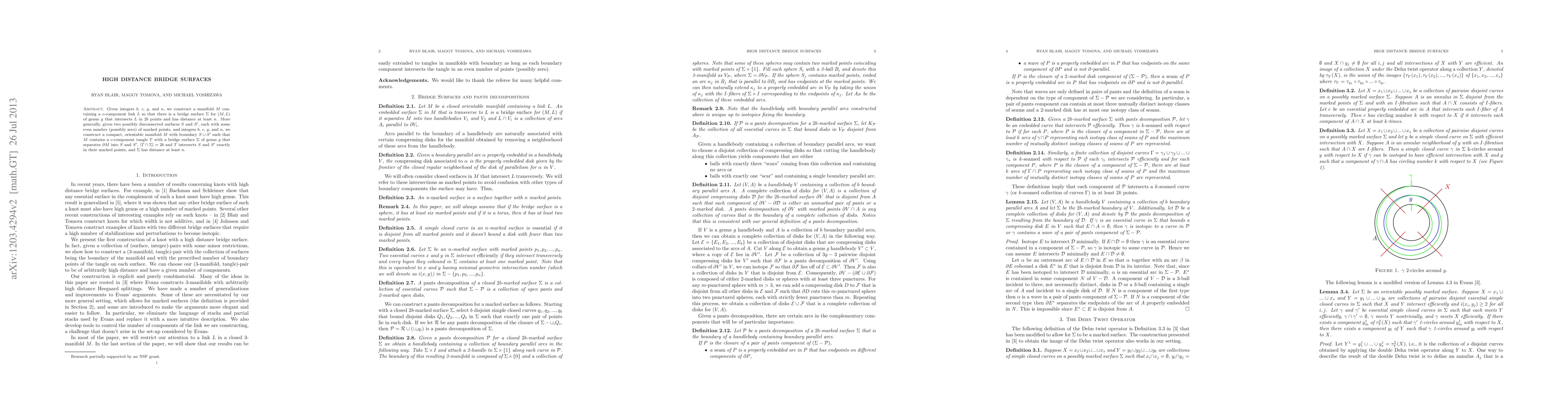 Given integers b, c, g, and n, we construct a manifold M containing a c-component link L so that there is a bridge surface Sigma for (M,L) of genus g that intersects L in 2b points and has distance at least n. More generally, given two possibly disconnected surfaces S and S', each with some even number (possibly zero) of marked points, and integers b, c, g, and n, we construct a compact, orientable manifold M with boundary S \cup S' such that M contains a c-component tangle T with a bridge surface Sigma of genus g that separates the boundary of M into S and S', |T \cap Sigma|=2b and T intersects S and S' exactly in their marked points, and Sigma has distance at least n.