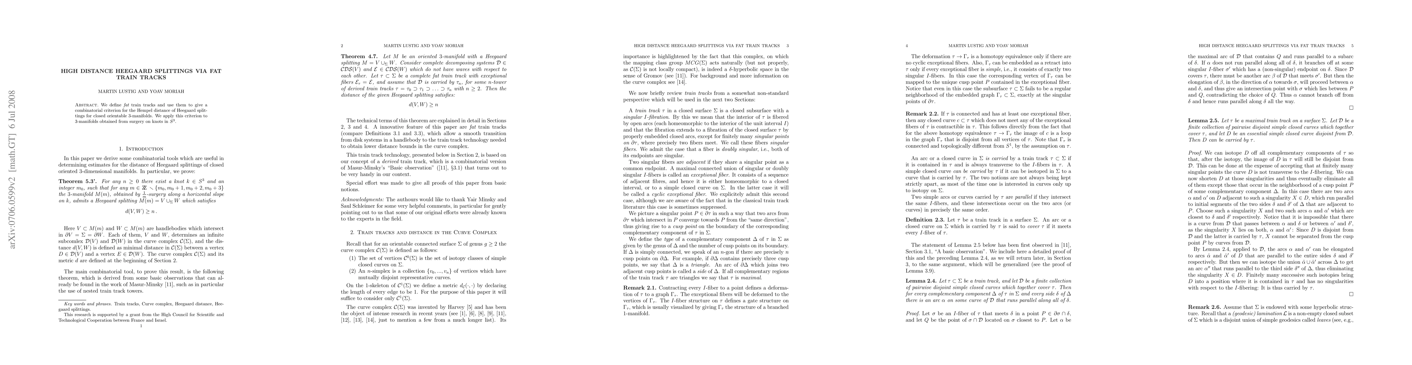 This paper introduces "fat" train tracks to define a combinatorial criterion for determining the Hempel distance in Heegaard splittings of closed orientable 3-manifolds, and applies this criterion to 3-manifolds resulting from surgeries on knots in the three sphere.