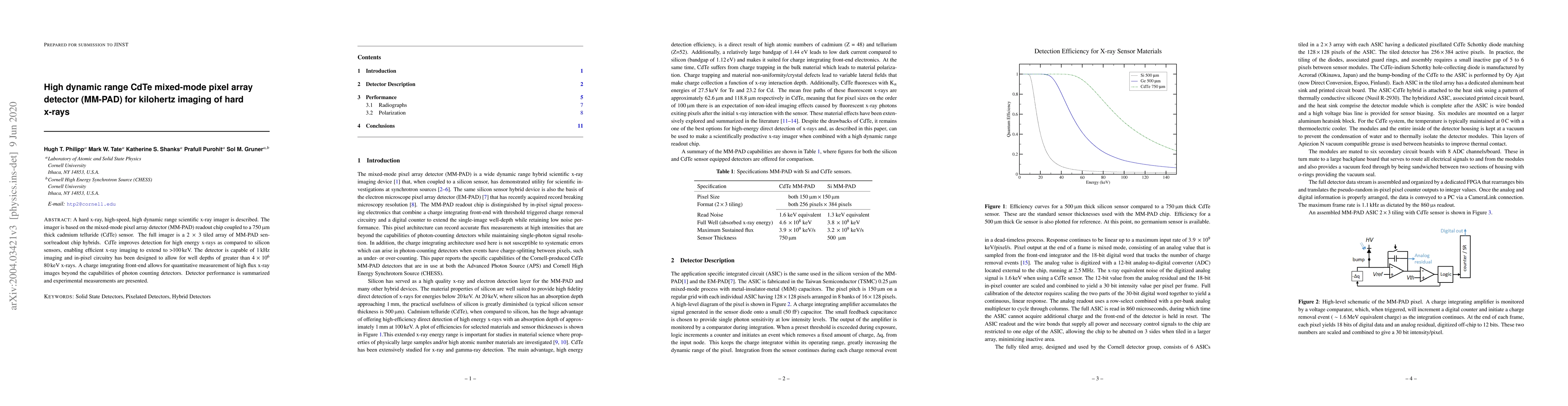 A hard x-ray, high-speed, high dynamic range scientific x-ray imager is described. The imager is based on the mixed-mode pixel array detector (MM-PAD) readout chip coupled to a 750 micron thick cadmium telluride (CdTe) sensor. The full imager is a 2 x 3 tiled array of MM-PAD sensor/readout chip hybrids. CdTe improves detection for high energy x-rays as compared to silicon sensors, enabling efficient x-ray imaging to extend to >100 keV. The detector is capable of 1 kHz imaging and in-pixel circuitry has been designed to allow for well depths of greater than 4 x 10^{6} 80 keV x-rays. A charge integrating front-end allows for quantitative measurement of high flux x-ray images beyond the capabilities of photon counting detectors. Detector performance is summarized and experimental measurements are presented.