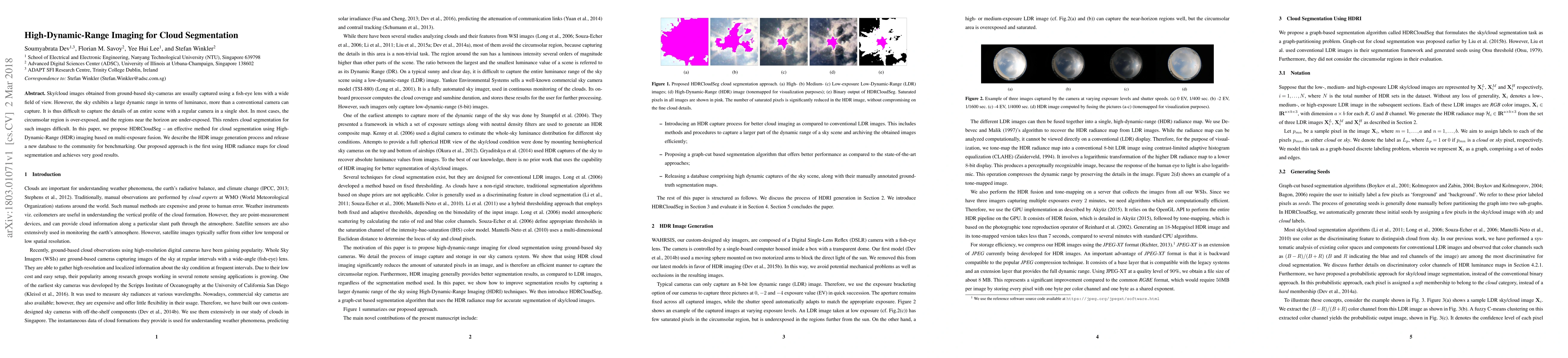Researchers developed HDRCloudSeg, a method for cloud segmentation using High-Dynamic-Range imaging to capture better details in sky/cloud images with large dynamic ranges.