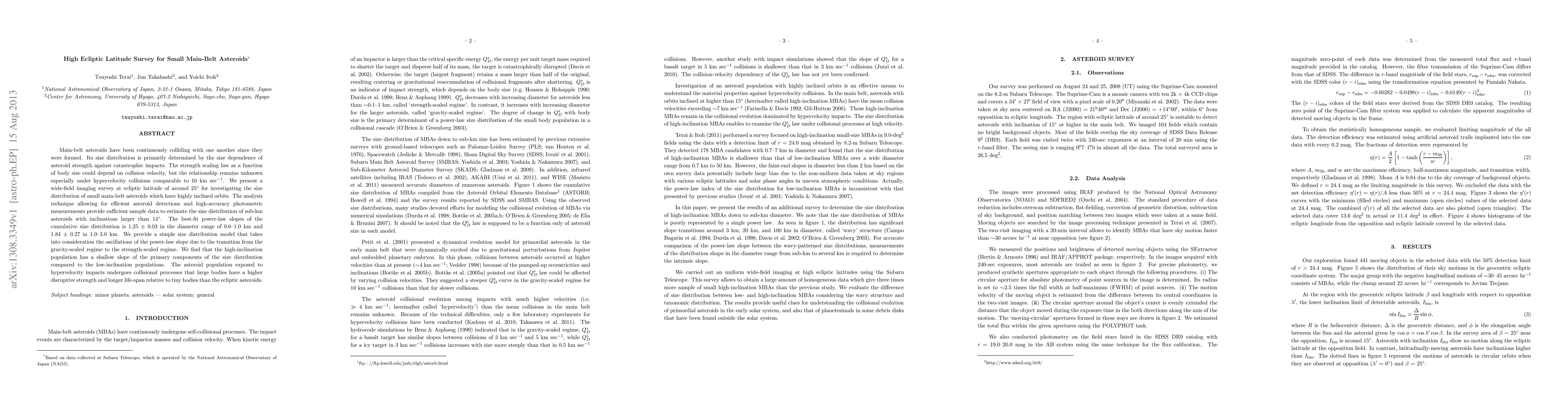 This survey investigates the size distribution of small main-belt asteroids with high orbital inclinations, revealing a shallower slope in their size distribution compared to low-inclination populations. The findings suggest that larger asteroids have greater disruptive strength and longer lifespans under hypervelocity collisions.