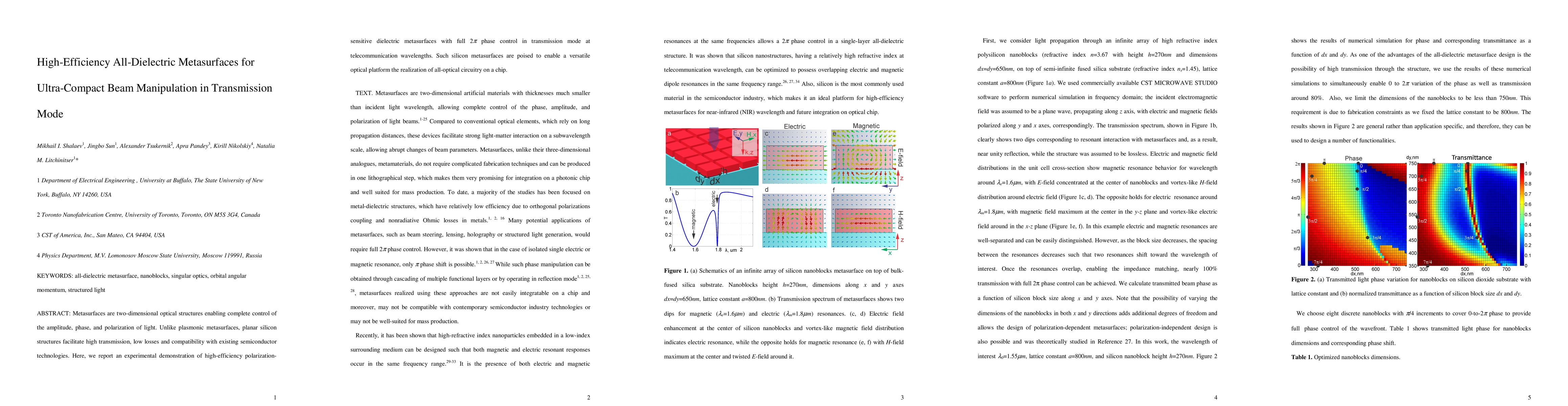 This research presents high-efficiency, polarization-sensitive silicon metasurfaces with full 2π phase control in transmission mode, offering low losses and compatibility with semiconductor technologies for ultra-compact beam manipulation. These metasurfaces pave the way for all-optical circuitry on a chip.