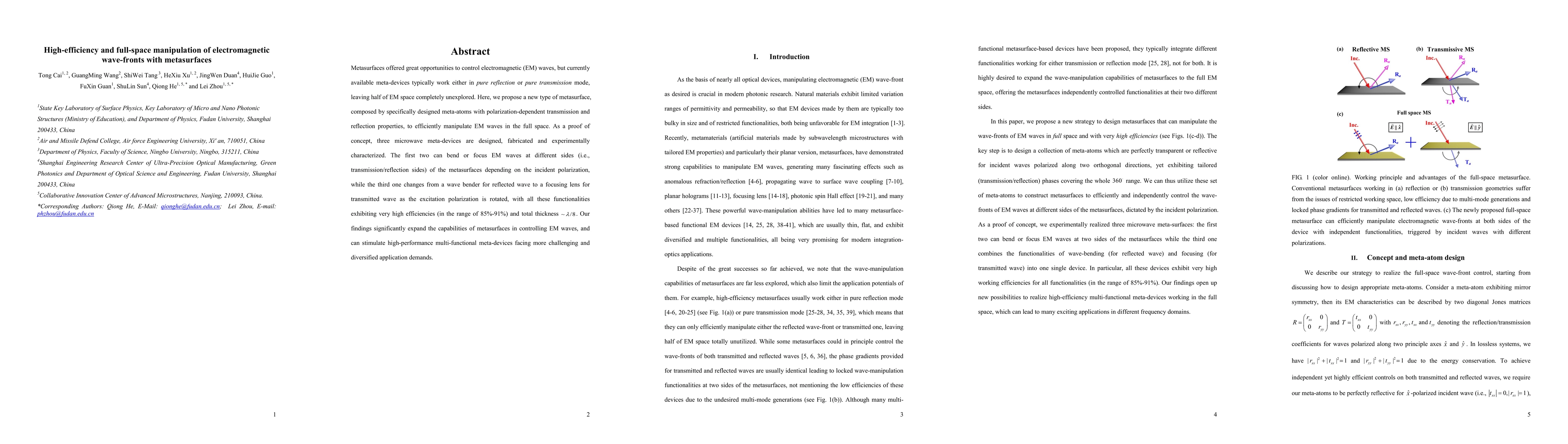 Metasurfaces offered great opportunities to control electromagnetic (EM) waves, but currently available meta-devices typically work either in pure reflection or pure transmission mode, leaving half of EM space completely unexplored. Here, we propose a new type of metasurface, composed by specifically designed meta-atoms with polarization-dependent transmission and reflection properties, to efficiently manipulate EM waves in the full space. As a proof of concept, three microwave meta-devices are designed, fabricated and experimentally characterized. The first two can bend or focus EM waves at different sides (i.e., transmission/reflection sides) of the metasurfaces depending on the incident polarization, while the third one changes from a wave bender for reflected wave to a focusing lens for transmitted wave as the excitation polarization is rotated, with all these functionalities exhibiting very high efficiencies (in the range of 85%-91%). Our findings significantly expand the capabilities of metasurfaces in controlling EM waves, and can stimulate high-performance multi-functional meta-devices facing more challenging and diversified application demands.