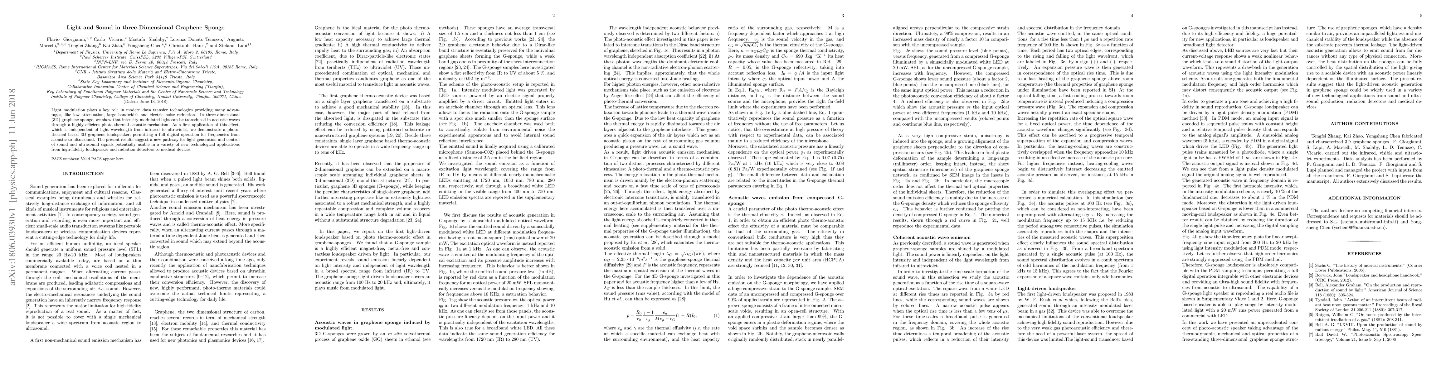 The conversion of light in sound plays a crucial role in spectroscopy, applied physics, and technology. In this paper, light sound conversion in 3D graphene sponge through a photothermoacoustic mechanism is reported. It is shown that the unique combination of mechanical, optical, and thermodynamic properties of graphene assembled in a 3D sponge structure allows an unprecedented high efficiency conversion independent of light wavelength from infrared to ultraviolet. As a first application of this effect, a photothermal based graphene sponge loudspeaker is demonstrated, providing a full digital operation for frequencies from acoustic to ultrasound. The present results suggest a new pathway for light generation and control of sound and ultrasound signals potentially usable in a variety of new technological applications from high fidelity loudspeaker and radiation detectors to medical devices.