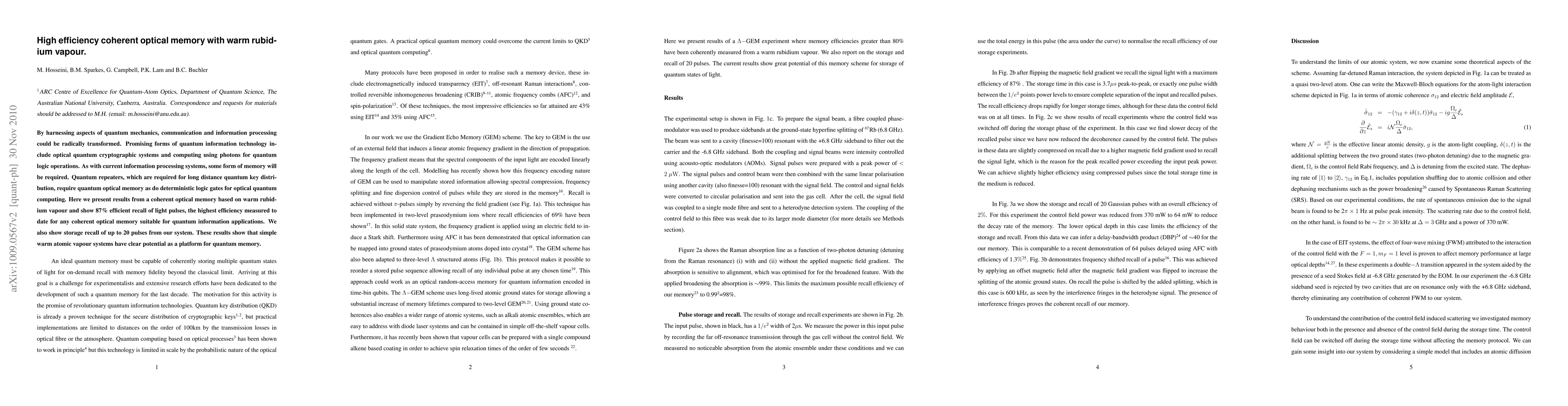This paper demonstrates a high-efficiency coherent optical memory using warm rubidium vapour, achieving 87% recall efficiency of light pulses, the highest to date. The system can store and recall up to 20 pulses, indicating potential for quantum memory applications in quantum communication and computing.