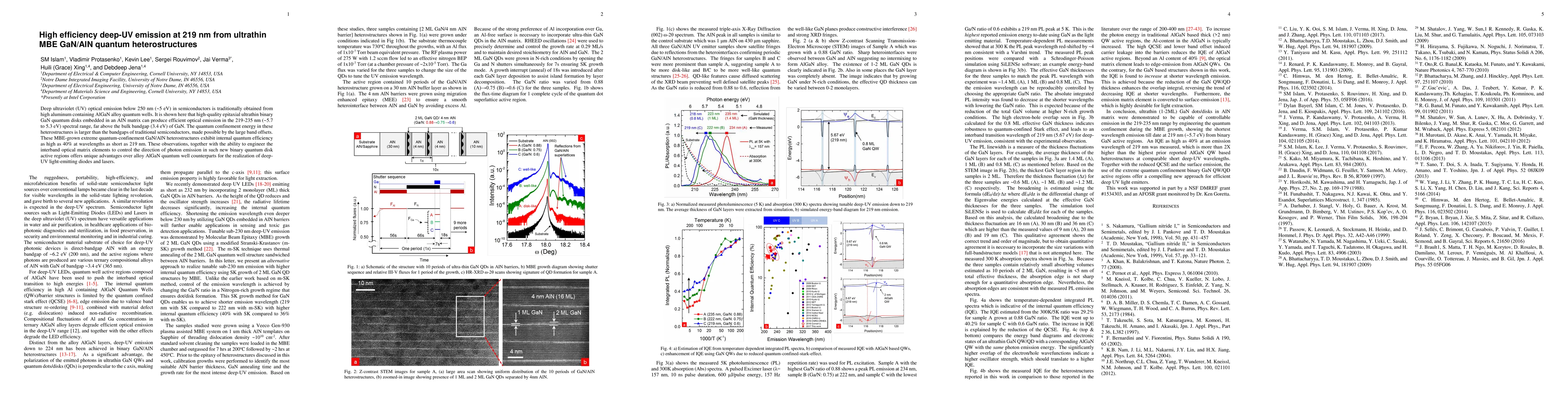 This paper demonstrates high-efficiency deep-UV emission at 219 nm from ultrathin MBE GaN/AlN quantum heterostructures, achieving internal quantum efficiency up to 40%. These structures offer advantages over traditional AlGaN quantum wells due to their engineered quantum confinement and potential for deep-UV light-emitting diodes and lasers.