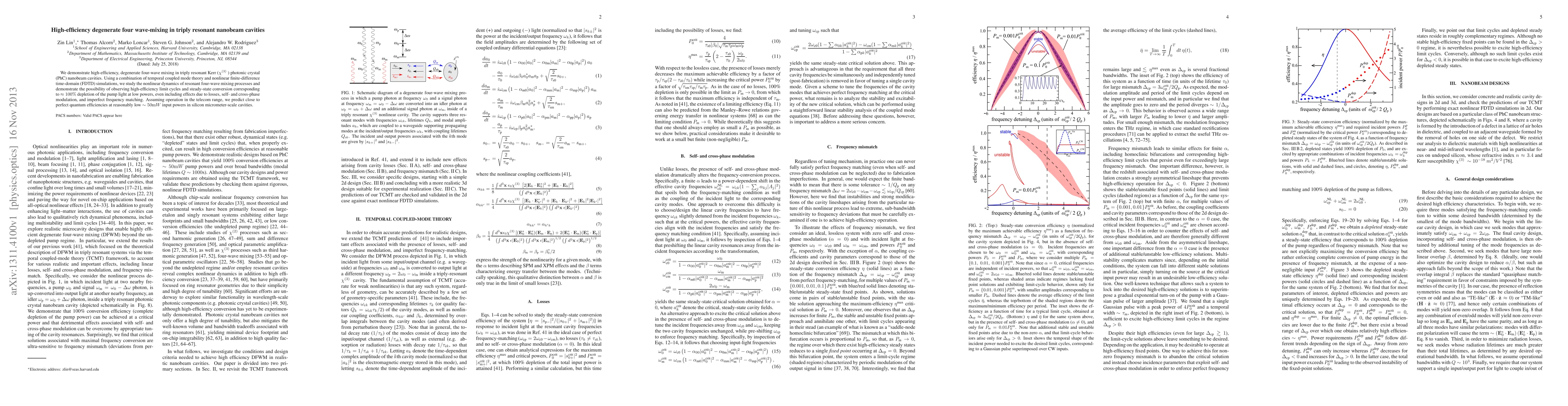 The paper demonstrates high-efficiency degenerate four-wave mixing in triply resonant nanobeam cavities using Kerr nonlinearity, achieving nearly 100% pump light depletion at low powers, and predicts close to perfect quantum efficiency at around 50 mW input power in silicon cavities. The study combines coupled mode theory and FDTD simulations to explore nonlinear dynamics and effects of losses and phase modulation.