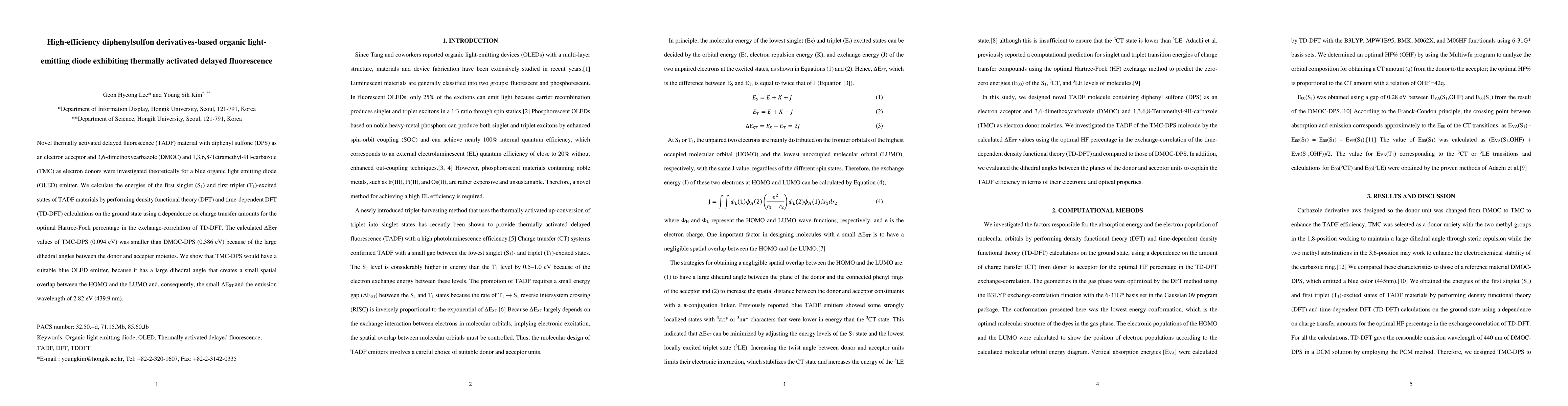 This paper investigates novel diphenylsulfone-based thermally activated delayed fluorescence (TADF) materials for blue organic light-emitting diodes (OLEDs). Using DFT and TD-DFT calculations, it finds that TMC-DPS has a smaller ΔEST value and a suitable emission wavelength of 439.9 nm due to its large dihedral angle, making it a promising blue OLED emitter.