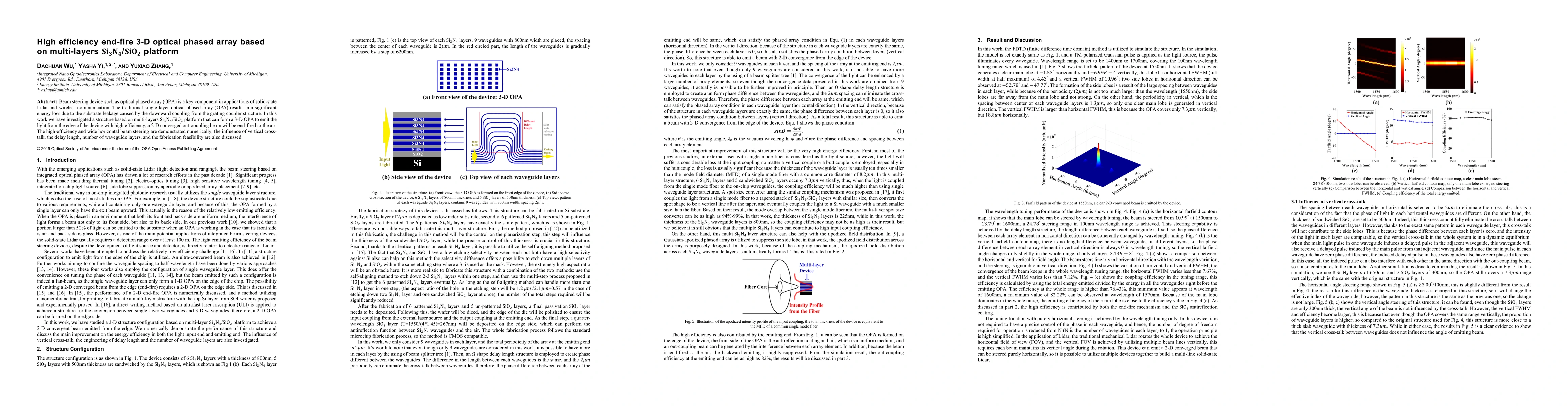 Beam steering device such as optical phased array (OPA) is a key component in applications of solid-state Lidar and wireless communication. The traditional single-layer optical phased array (OPA) results in a significant energy loss due to the substrate leakage caused by the downward coupling from the grating coupler structure. In this work we have investigated a structure based on multi-layers Si3N4/SiO2 platform that can form a 3-D OPA to emit the light from the edge of the device with high efficiency, a 2-D converged out-coupling beam will be end-fired to the air. The high efficiency and wide horizontal beam steering are demonstrated numerically, the influence of vertical cross-talk, the delay length, number of waveguide layers, and the fabrication feasibility are also discussed.