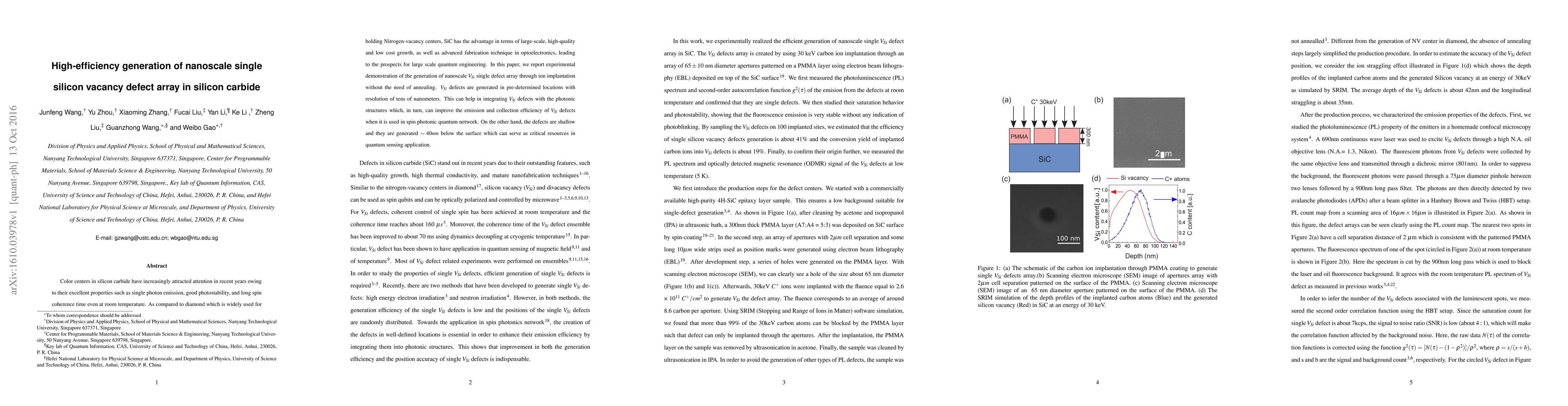 This paper demonstrates the high-efficiency generation of nanoscale single silicon vacancy defect arrays in silicon carbide via ion implantation, achieving precise placement without annealing. These defects, located shallowly beneath the surface, enhance both quantum network applications and quantum sensing.