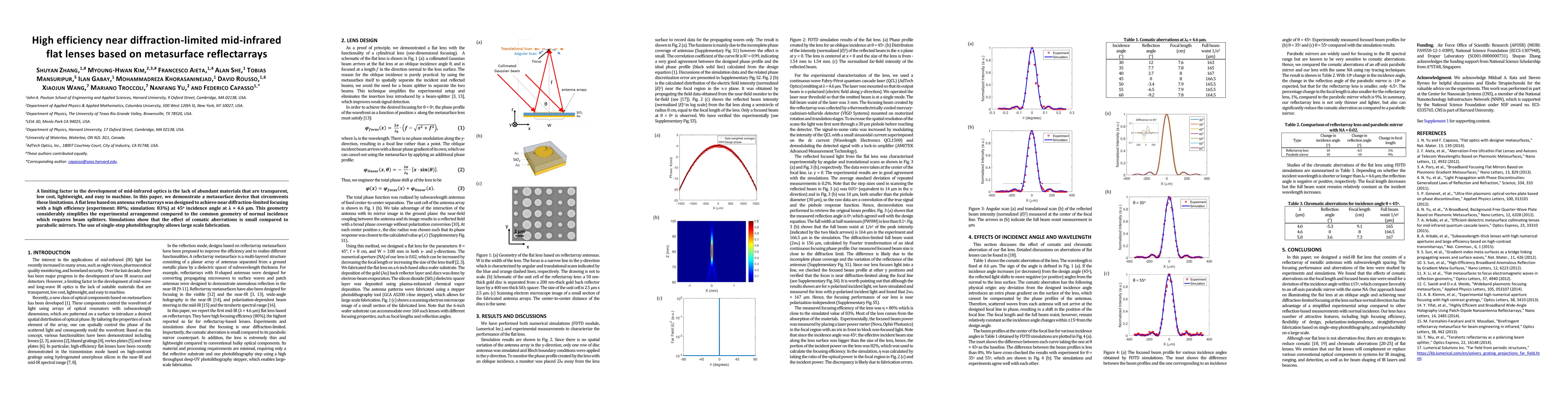 A limiting factor in the development of mid-infrared optics is the lack of abundant materials that are transparent, low cost, lightweight, and easy to machine. In this paper, we demonstrate a metasurface device that circumvents these limitations. A flat lens based on antenna reflectarrays was designed to achieve near diffraction-limited focusing with a high efficiency (experiment: 80%, simulation: 83%) at 45(o) incidence angle at {\lambda} = 4.6 {\mu}m. This geometry considerably simplifies the experimental arrangement compared to the common geometry of normal incidence which requires beam splitters. Simulations show that the effect of comatic aberrations is small compared to parabolic mirrors. The use of single-step photolithography allows large scale fabrication.