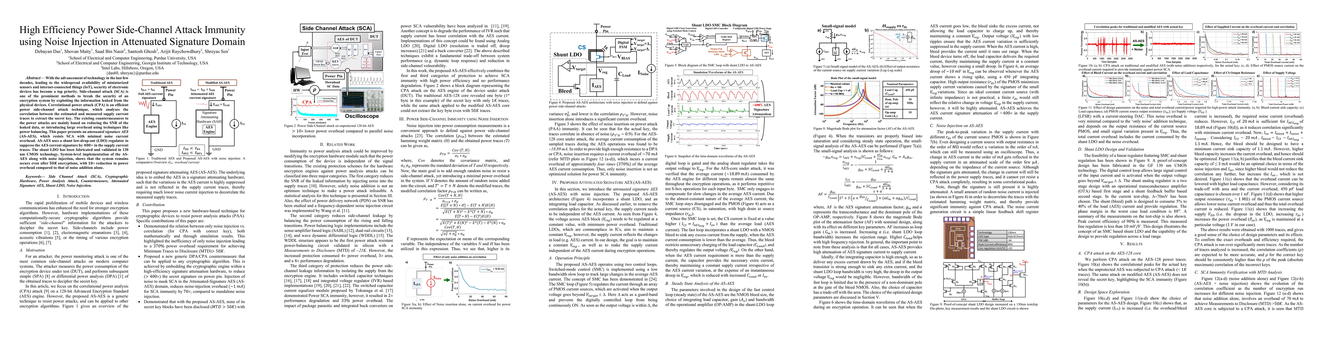 This paper proposes an attenuated signature AES (AS-AES) method to enhance power side-channel attack immunity using noise injection in the attenuated signature domain, achieving high efficiency with minimal power overhead. The system, validated in 130 nm CMOS, demonstrates security after 50K encryptions with a 10x reduction in power overhead compared to traditional noise addition alone.