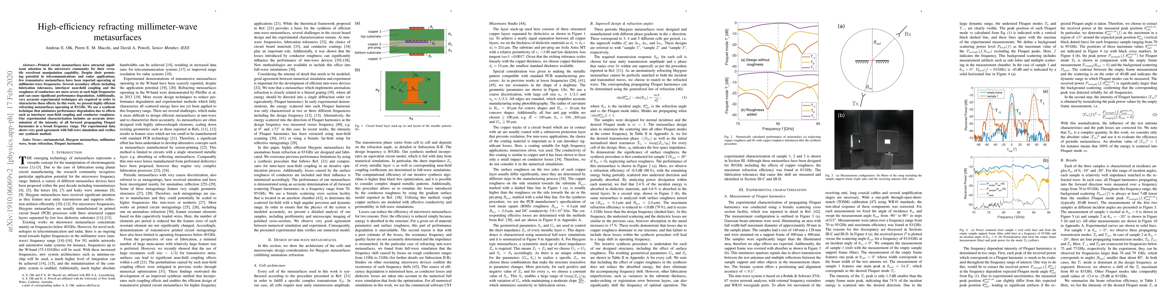 Printed circuit metasurfaces have attracted significant attention in the microwave community for their versatile wavefront manipulation capability. Despite their promising potential in telecommunications and radar applications, few transmissive metasurfaces have been reported operating at millimeter-wave frequencies. Several secondary effects including fabrication tolerances, interlayer near-field coupling and the roughness of conductors are more severe at such high frequencies and can cause significant performance degradation. Additionally, very accurate experimental techniques are required in order to characterise these effects. In this work, we present highly efficient refracting metasurfaces operating at 83 GHz. We use a synthesis technique that minimizes performance degradation due to effects such as interlayer near-field coupling and conductor roughness. Our experimental characterization includes an accurate determination of the intensity of all forward propagating Floquet harmonics in a broad frequency range. The experimental data shows very good agreement with full-wave simulation and verifies our synthesis method.