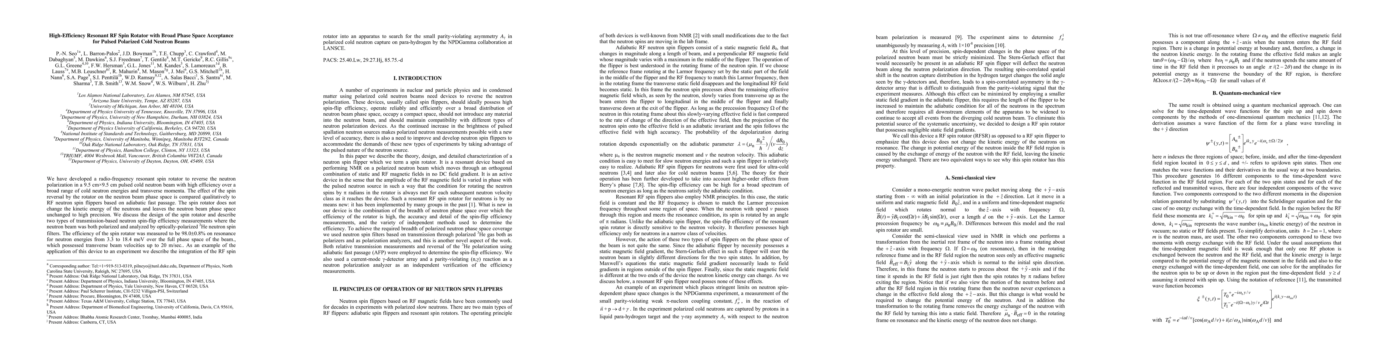 This paper presents a high-efficiency resonant RF spin rotator that effectively reverses neutron polarization in a pulsed cold neutron beam without altering the beam's kinetic energy or phase space. The device achieved 98.0% efficiency over a broad energy range, demonstrating potential for applications in precision experiments like searching for parity-violating asymmetries.