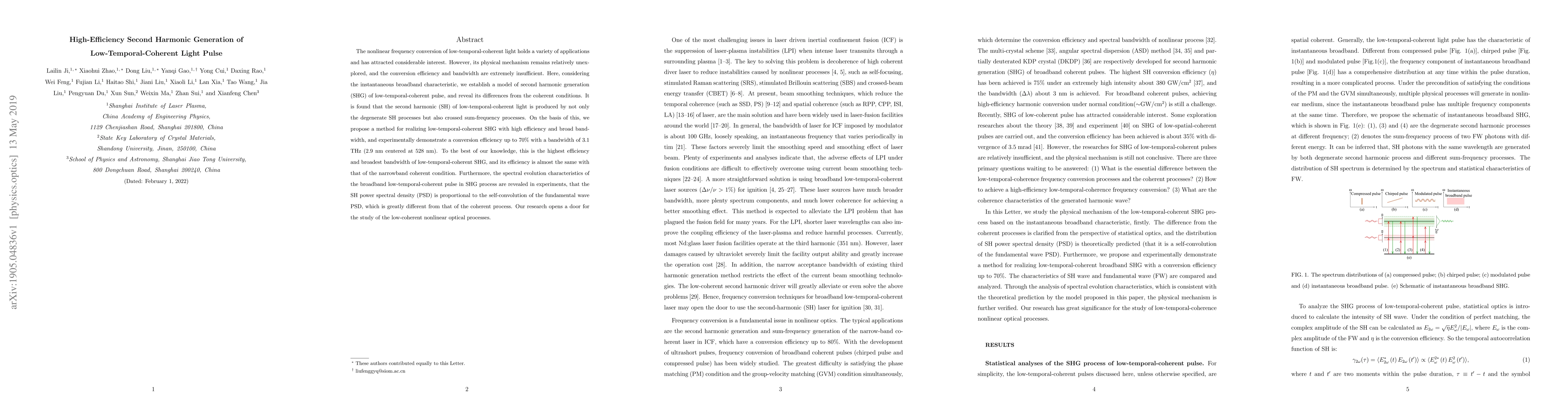 This paper presents a model for high-efficiency second harmonic generation (SHG) of low-temporal-coherent light pulses, achieving a conversion efficiency of up to 70% with a broad bandwidth of 3.1 THz. The study reveals that SHG under low-coherence conditions involves both degenerate and crossed sum-frequency processes, differing from coherent conditions.