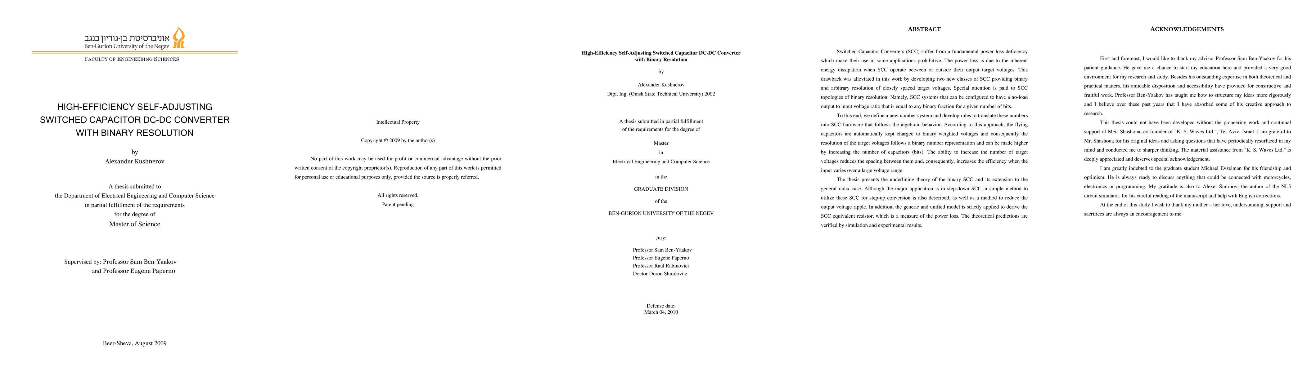 Switched-Capacitor Converters (SCC) suffer from a fundamental power loss deficiency which make their use in some applications prohibitive. The power loss is due to the inherent energy dissipation when SCC operate between or outside their output target voltages. This drawback was alleviated in this work by developing two new classes of SCC providing binary and arbitrary resolution of closely spaced target voltages. Special attention is paid to SCC topologies of binary resolution. Namely, SCC systems that can be configured to have a no-load output to input voltage ratio that is equal to any binary fraction for a given number of bits. To this end, we define a new number system and develop rules to translate these numbers into SCC hardware that follows the algebraic behavior. According to this approach, the flying capacitors are automatically kept charged to binary weighted voltages and consequently the resolution of the target voltages follows a binary number representation and can be made higher by increasing the number of capacitors (bits). The ability to increase the number of target voltages reduces the spacing between them and, consequently, increases the efficiency when the input varies over a large voltage range. The thesis presents the underlining theory of the binary SCC and its extension to the general radix case. Although the major application is in step-down SCC, a simple method to utilize these SCC for step-up conversion is also described, as well as a method to reduce the output voltage ripple. In addition, the generic and unified model is strictly applied to derive the SCC equivalent resistor, which is a measure of the power loss. The theoretical predictions are verified by simulation and experimental results.
