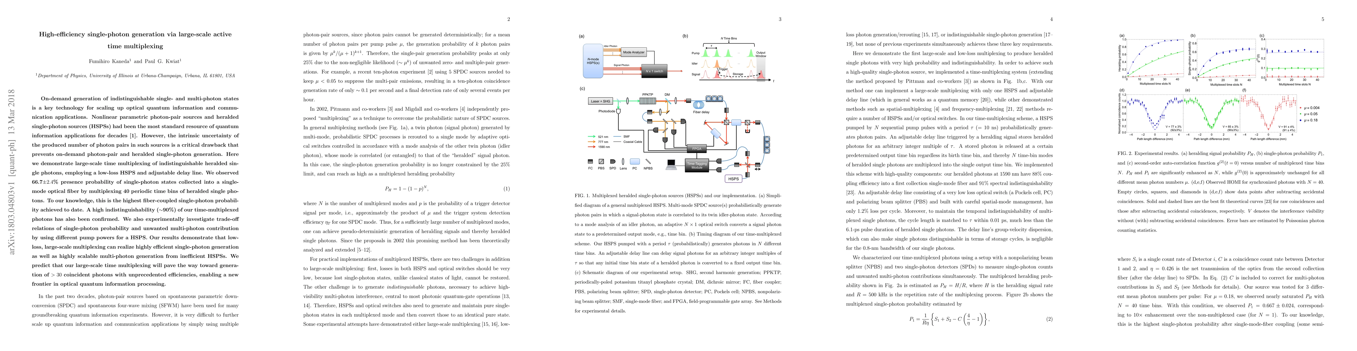 This paper demonstrates a method for high-efficiency single-photon generation using large-scale active time multiplexing, achieving a 66.7% presence probability of single-photon states in a fiber-coupled setup. The technique employs a low-loss heralded single-photon source and an adjustable delay line, showing high indistinguishability (~90%) and paving the way for scalable multi-photon generation.