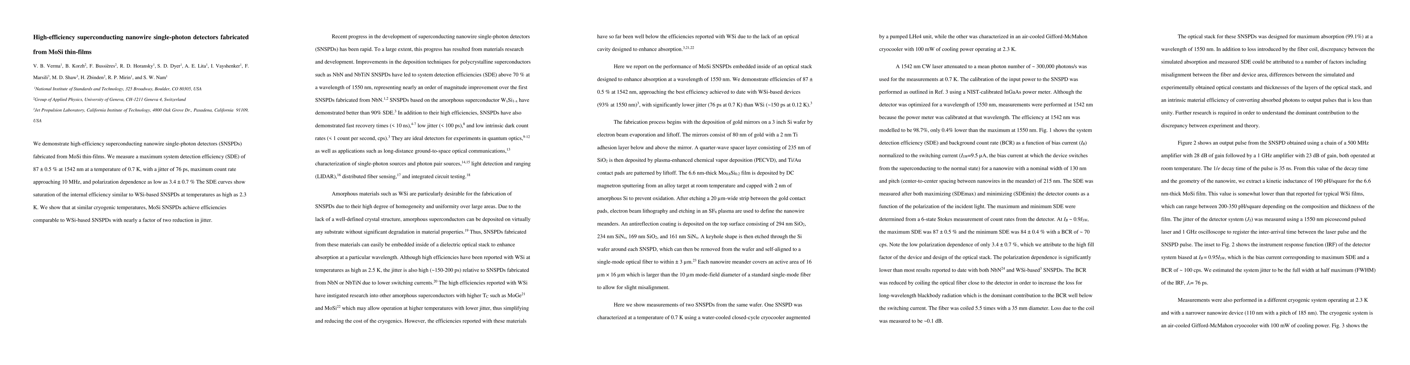 This paper demonstrates the fabrication of high-efficiency superconducting nanowire single-photon detectors (SNSPDs) from MoSi thin-films, achieving a maximum system detection efficiency of 87 ± 0.5% at 1542 nm and a jitter of 76 ps, comparable to WSi-based SNSPDs but with nearly half the jitter.