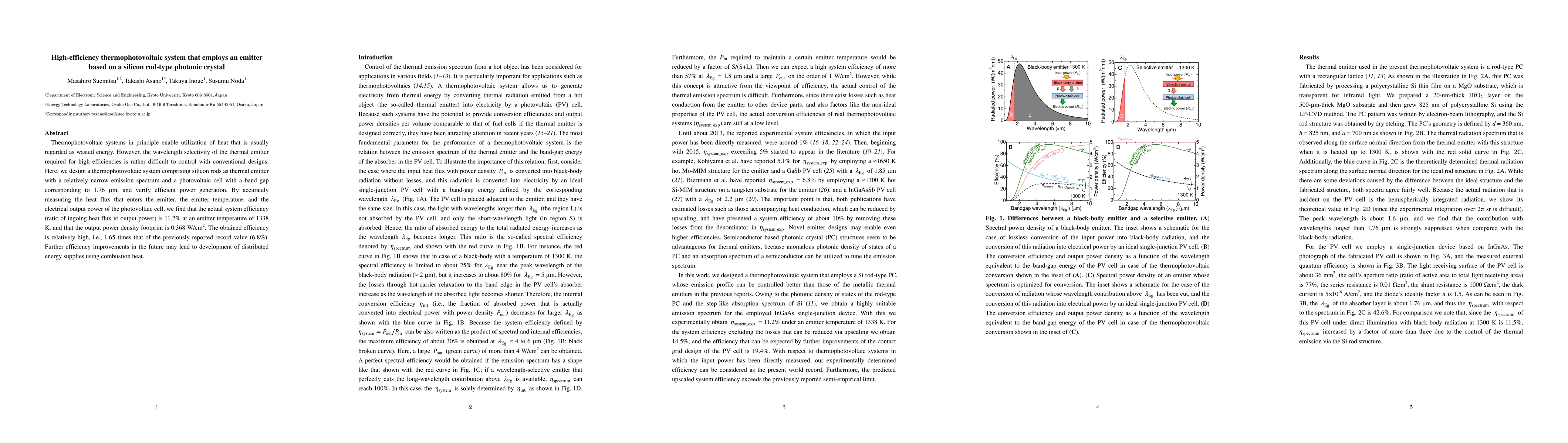 Thermophotovoltaic systems in principle enable utilization of heat that is usually regarded as wasted energy. However, the wavelength selectivity of the thermal emitter required for high efficiencies is rather difficult to control with conventional designs. Here, we design a thermophotovoltaic system comprising silicon rods as thermal emitter with a relatively narrow emission spectrum and a photovoltaic cell with a band gap corresponding to 1.76 $\mu$m, and verify efficient power generation. By accurately measuring the heat flux that enters the emitter, the emitter temperature, and the electrical output power of the photovoltaic cell, we find that the actual system efficiency (ratio of ingoing heat flux to output power) is 11.2% at an emitter temperature of 1338 K, and that the output power density footprint is 0.368 W/cm2. The obtained efficiency is relatively high, i.e., 1.65 times that of the previously reported record value (6.8%). Further efficiency improvements in the future may lead to development of distributed energy supplies using combustion heat.