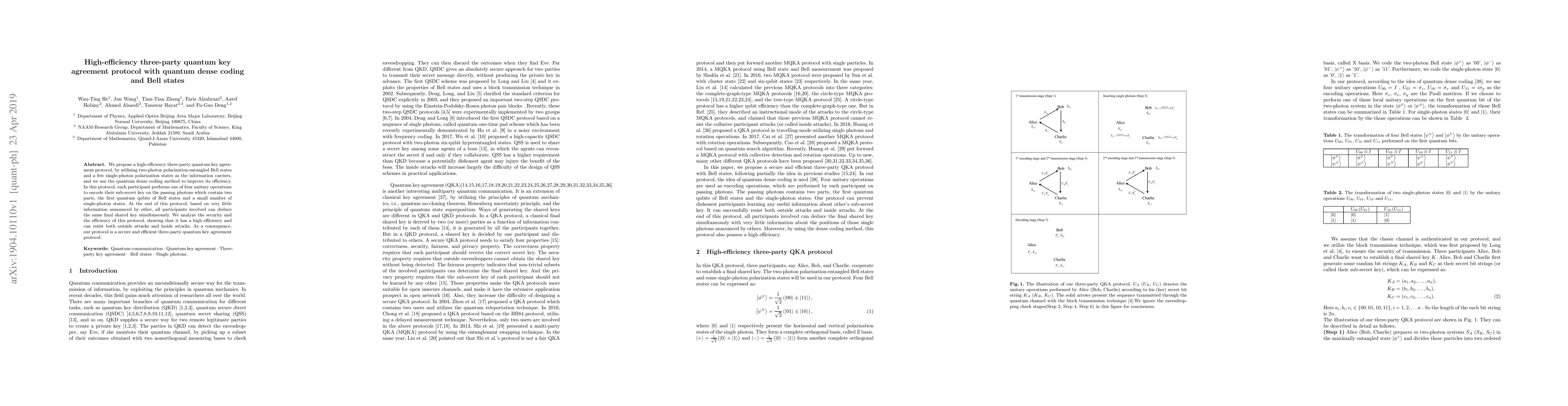 This paper proposes a high-efficiency three-party quantum key agreement protocol using quantum dense coding and Bell states. The protocol employs unitary operations on entangled Bell states and single-photon states to encode sub-secret keys, ensuring high efficiency and security against both external and internal attacks.