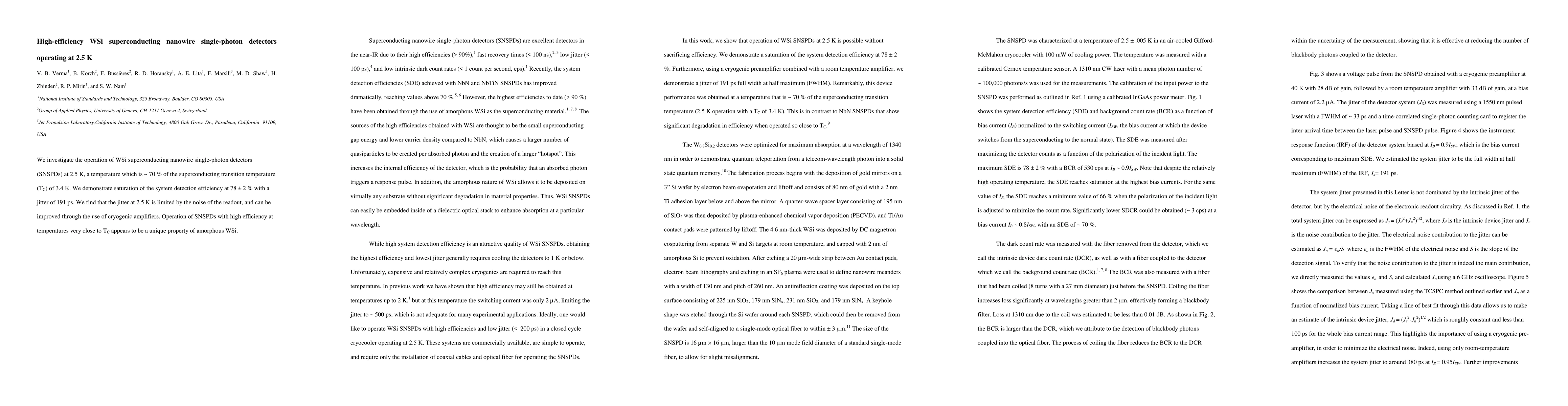 This study investigates WSi superconducting nanowire single-photon detectors (SNSPDs) operating at 2.5 K, achieving a high detection efficiency of 78 ± 2% with a jitter of 191 ps, demonstrating that the jitter is primarily noise-limited and can be improved with cryogenic amplifiers. The high efficiency near the superconducting transition temperature is a distinctive feature of amorphous WSi.
