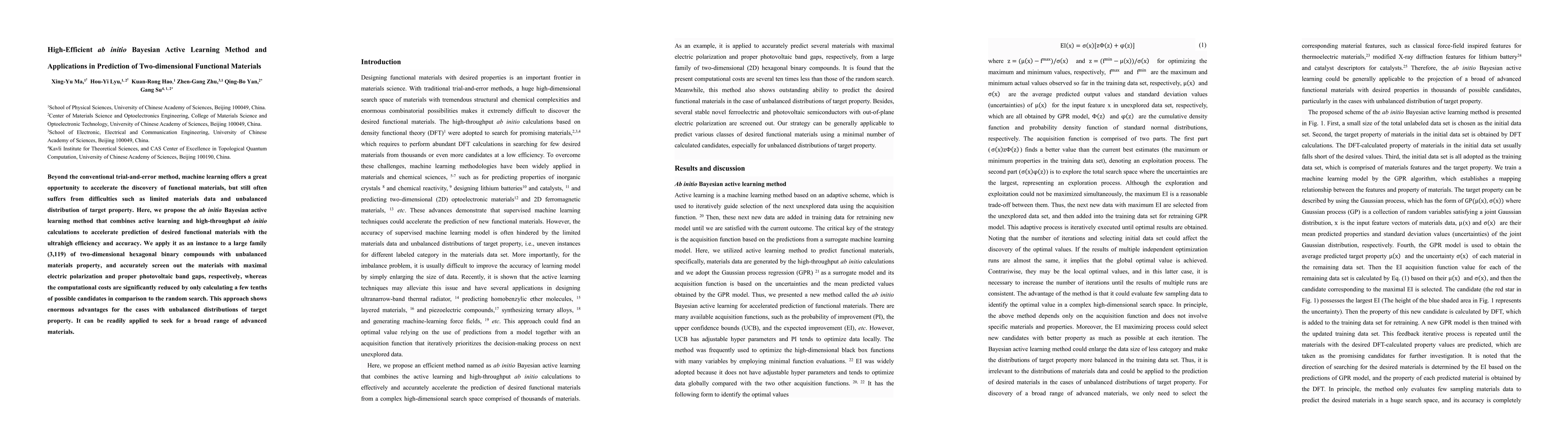 This paper proposes an ab initio Bayesian active learning method to efficiently predict functional materials, significantly reducing computational costs by focusing on a small subset of candidates. It successfully screens two-dimensional hexagonal binary compounds for materials with optimal electric polarization and photovoltaic band gaps.
