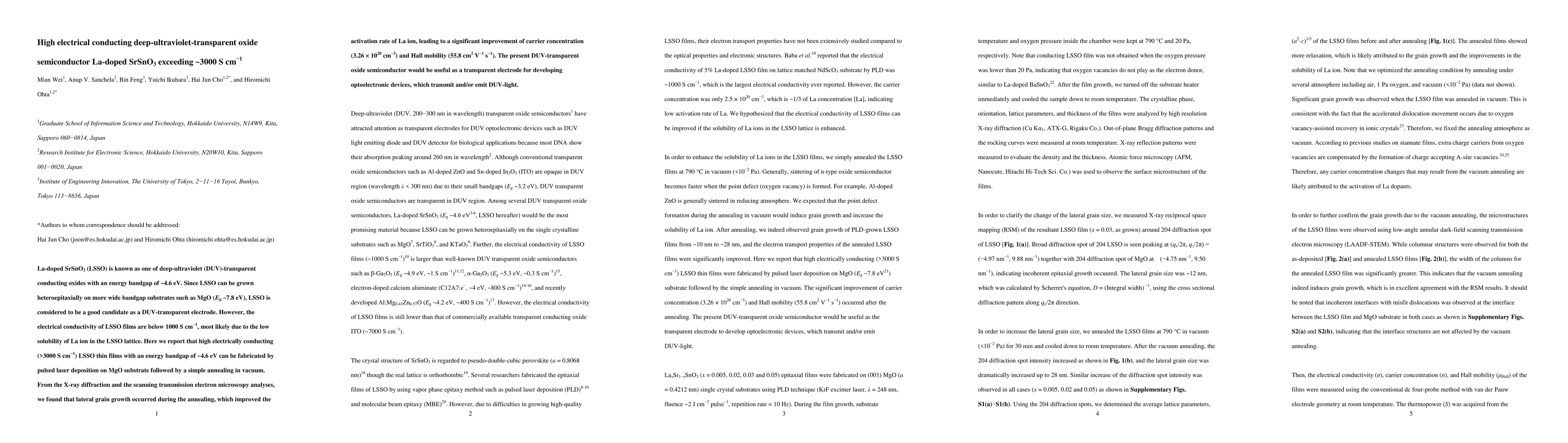 This paper reports the fabrication of high electrically conducting (>3000 S cm^-1) La-doped SrSnO3 thin films via pulsed laser deposition and subsequent annealing, achieving improved carrier concentration and mobility due to lateral grain growth. These DUV-transparent oxide semiconductors are promising for applications in optoelectronic devices.
