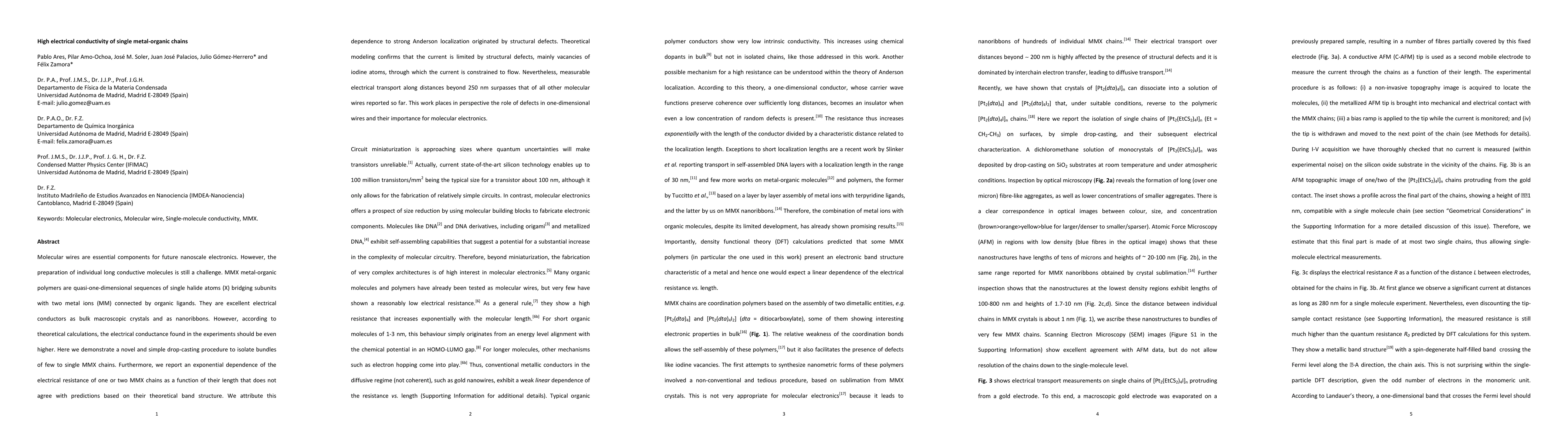 Researchers developed a method to isolate single metal-organic chains, revealing that electrical resistance decreases exponentially with chain length, contradicting theoretical predictions. This is attributed to structural defects causing Anderson localization, yet current flows measurably over 250 nm, outperforming other molecular wires, highlighting defects' crucial role in one-dimensional wires for molecular electronics.