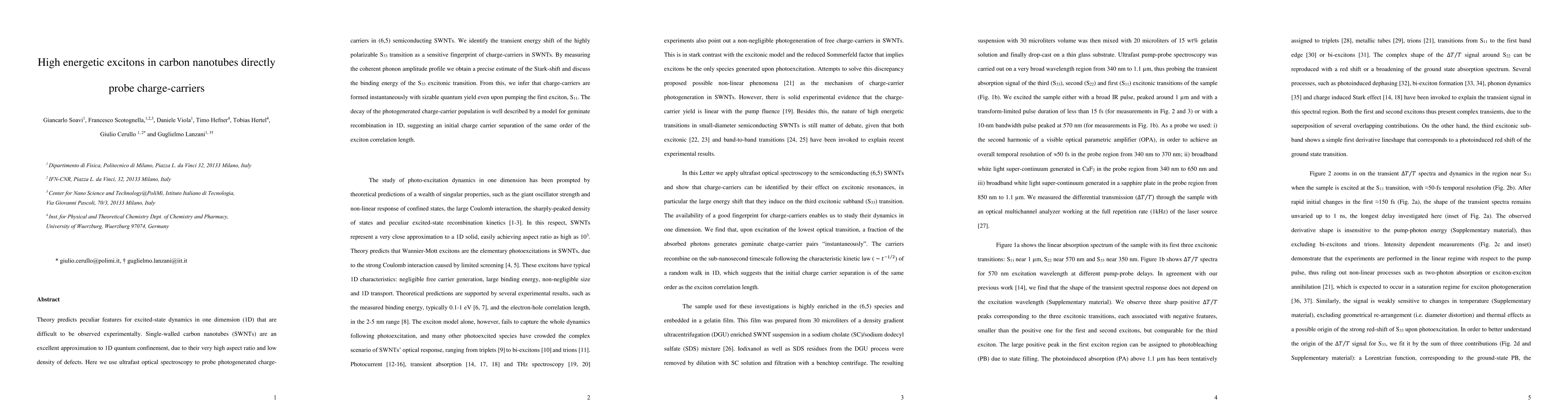 This study employs ultrafast optical spectroscopy to investigate charge-carrier dynamics in semiconducting carbon nanotubes, finding instantaneous formation of carriers upon photoexcitation and a geminate recombination process reflective of 1D quantum confinement. The transient energy shift of the S33 transition serves as a sensitive indicator of charge-carriers, with decay behavior consistent with 1D exciton correlation lengths.