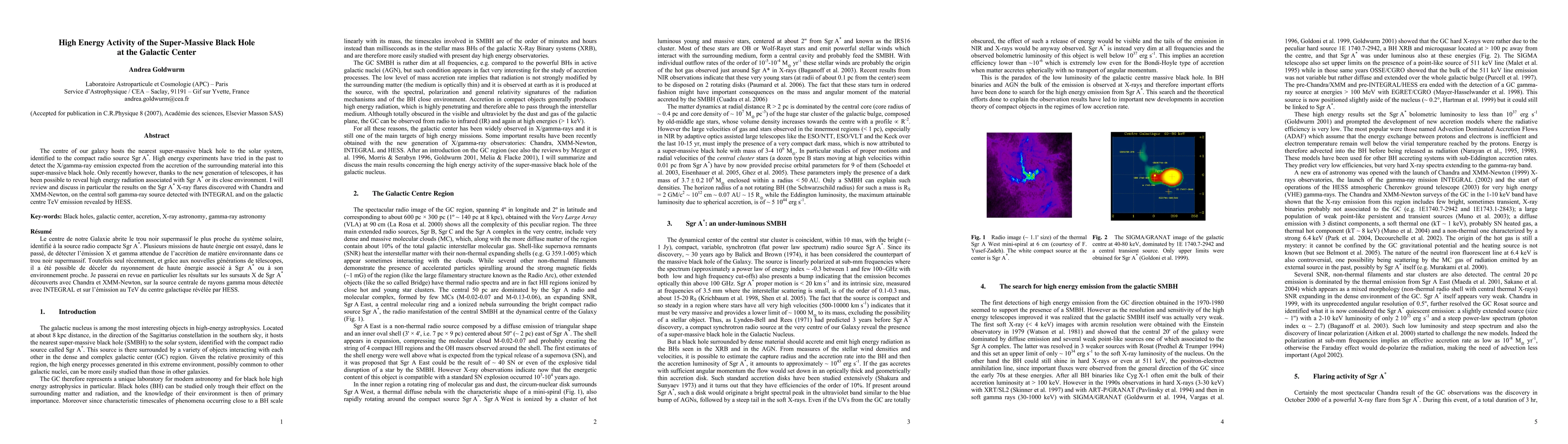 This paper reviews recent high energy observations of the super-massive black hole at the galactic center, Sgr A*, focusing on X-ray flares detected by Chandra and XMM-Newton, a central soft gamma-ray source found with INTEGRAL, and TeV emissions identified by HESS. These findings highlight the ongoing activity and emissions from the black hole's accretion processes.