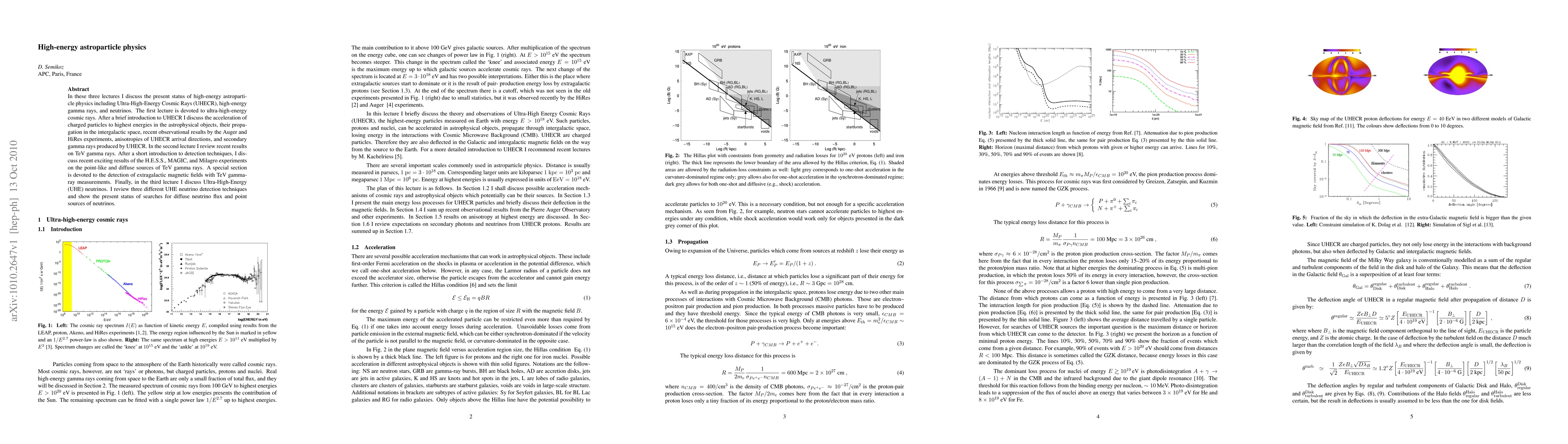In these three lectures I discuss the present status of high-energy astroparticle physics including Ultra-High-Energy Cosmic Rays (UHECR), high-energy gamma rays, and neutrinos. The first lecture is devoted to ultra-high-energy cosmic rays. After a brief introduction to UHECR I discuss the acceleration of charged particles to highest energies in the astrophysical objects, their propagation in the intergalactic space, recent observational results by the Auger and HiRes experiments, anisotropies of UHECR arrival directions, and secondary gamma rays produced by UHECR. In the second lecture I review recent results on TeV gamma rays. After a short introduction to detection techniques, I discuss recent exciting results of the H.E.S.S., MAGIC, and Milagro experiments on the point-like and diffuse sources of TeV gamma rays. A special section is devoted to the detection of extragalactic magnetic fields with TeV gamma-ray measurements. Finally, in the third lecture I discuss Ultra-High-Energy (UHE) neutrinos. I review three different UHE neutrino detection techniques and show the present status of searches for diffuse neutrino flux and point sources of neutrinos.