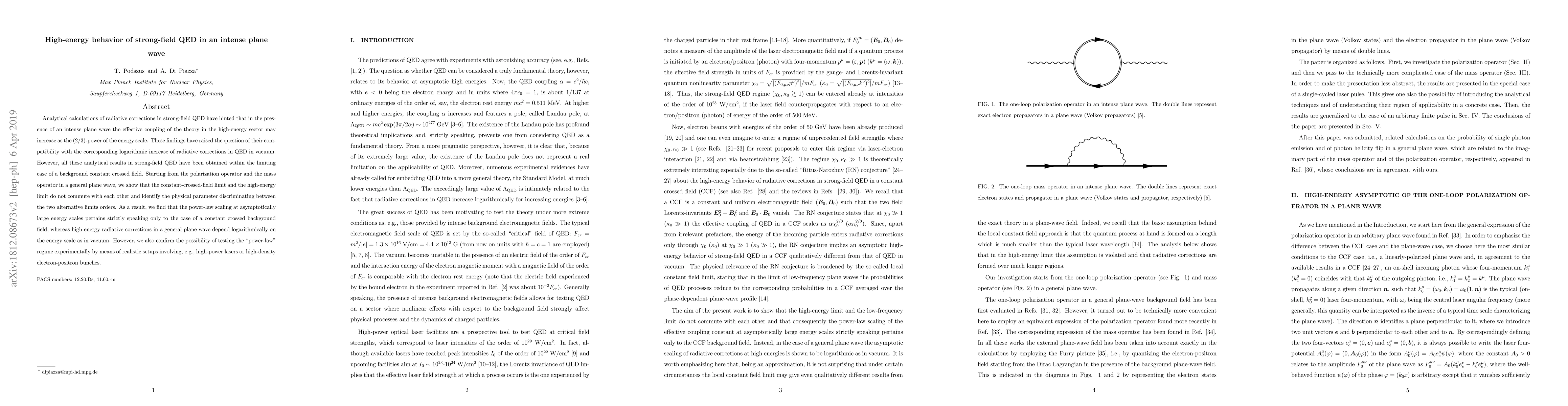 Analytical calculations of radiative corrections in strong-field QED have hinted that in the presence of an intense plane wave the effective coupling of the theory in the high-energy sector may increase as the $(2/3)$-power of the energy scale. These findings have raised the question of their compatibility with the corresponding logarithmic increase of radiative corrections in QED in vacuum. However, all these analytical results in strong-field QED have been obtained within the limiting case of a background constant crossed field. Starting from the polarization operator and the mass operator in a general plane wave, we show that the constant-crossed-field limit and the high-energy limit do not commute with each other and identify the physical parameter discriminating between the two alternative limits orders. As a result, we find that the power-law scaling at asymptotically large energy scales pertains strictly speaking only to the case of a constant crossed background field, whereas high-energy radiative corrections in a general plane wave depend logarithmically on the energy scale as in vacuum. However, we also confirm the possibility of testing the ``power-law'' regime experimentally by means of realistic setups involving, e.g., high-power lasers or high-density electron-positron bunches.