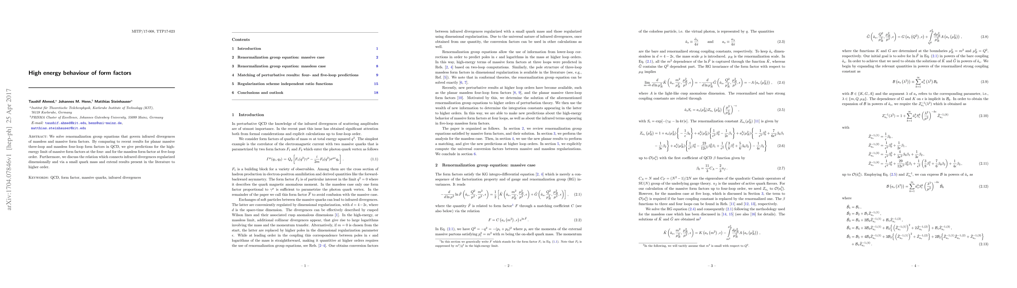 This paper solves renormalization group equations to analyze the infrared divergences of both massless and massive form factors in QCD, providing predictions for their high-energy behavior at four-loop and five-loop orders. It also discusses the connection between dimensional regularization and small quark mass regularization of infrared divergences.