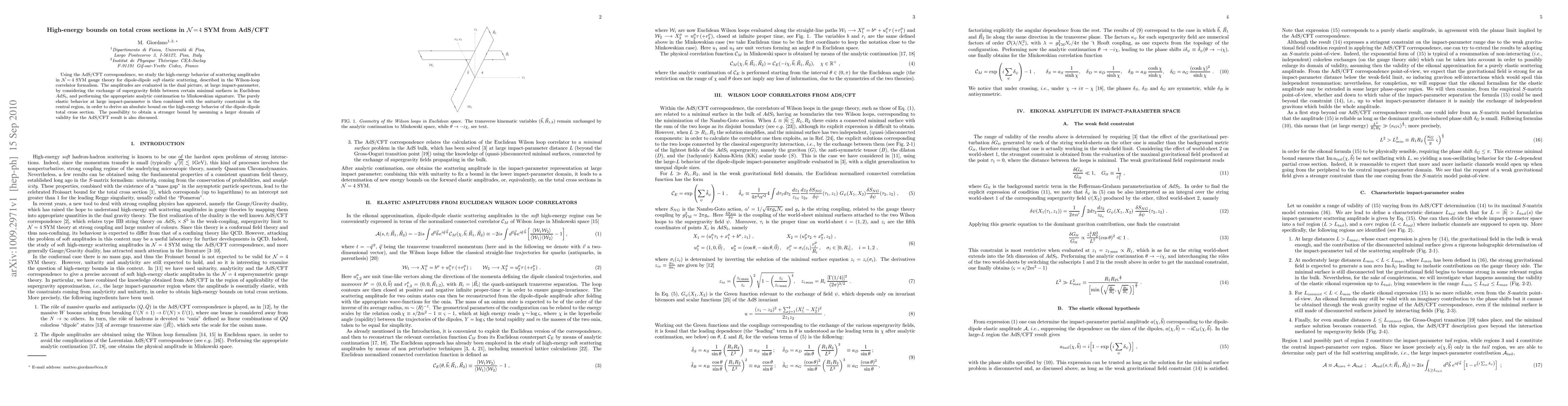 Using the AdS/CFT correspondence, we study the high-energy behavior of scattering amplitudes in N=4 SYM gauge theory for dipole-dipole soft elastic scattering, described in the Wilson-loop correlator formalism. The amplitudes are evaluated in the dual picture, at large impact-parameter, by considering the exchange of supergravity fields between certain minimal surfaces in Euclidean AdS_5, and performing the appropriate analytic continuation to Minkowskian signature. The purely elastic behavior at large impact-parameter is then combined with the unitarity constraint in the central region, in order to derive an absolute bound on the high-energy behavior of the dipole-dipole total cross section. The possibility to obtain a stronger bound by assuming a larger domain of validity for the AdS/CFT result is also discussed.