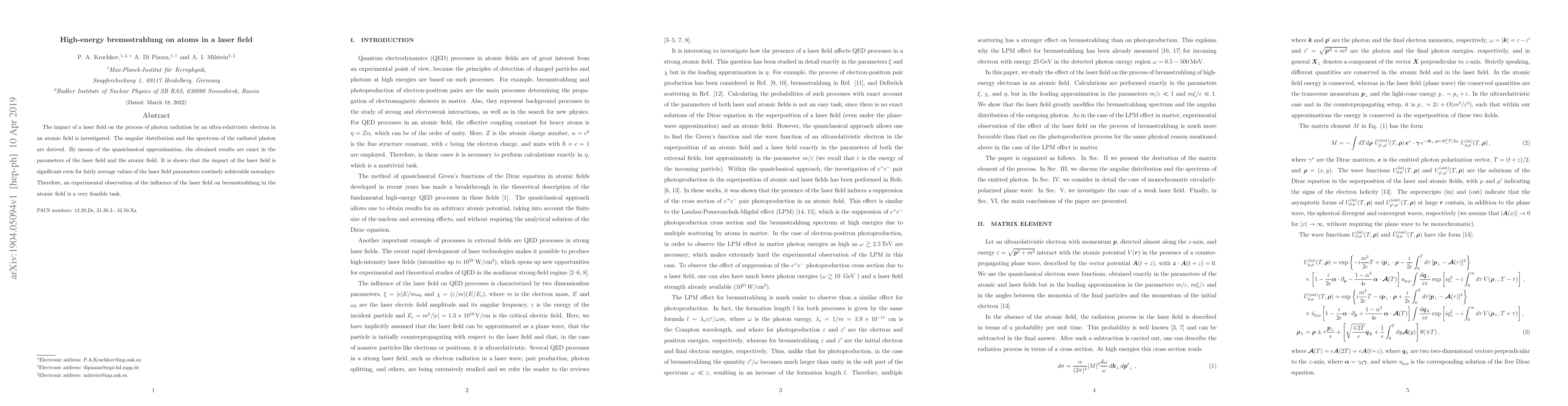 The impact of a laser field on the process of photon radiation by an ultra-relativistic electron in an atomic field is investigated. The angular distribution and the spectrum of the radiated photon are derived. By means of the quasiclassical approximation, the obtained results are exact in the parameters of the laser field and the atomic field. It is shown that the impact of the laser field is significant even for fairly average values of the laser field parameters routinely achievable nowadays. Therefore, an experimental observation of the influence of the laser field on bremsstrahlung in the atomic field is a very feasible task.